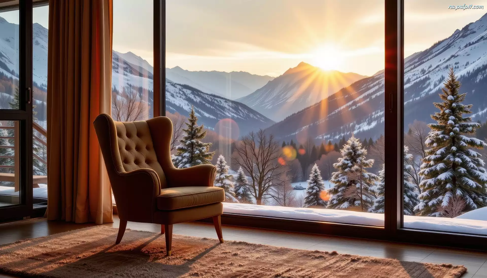 Grafika AI, Góry, Zima, Pokój, Fotel, Okno, Słońce Na Pulpit