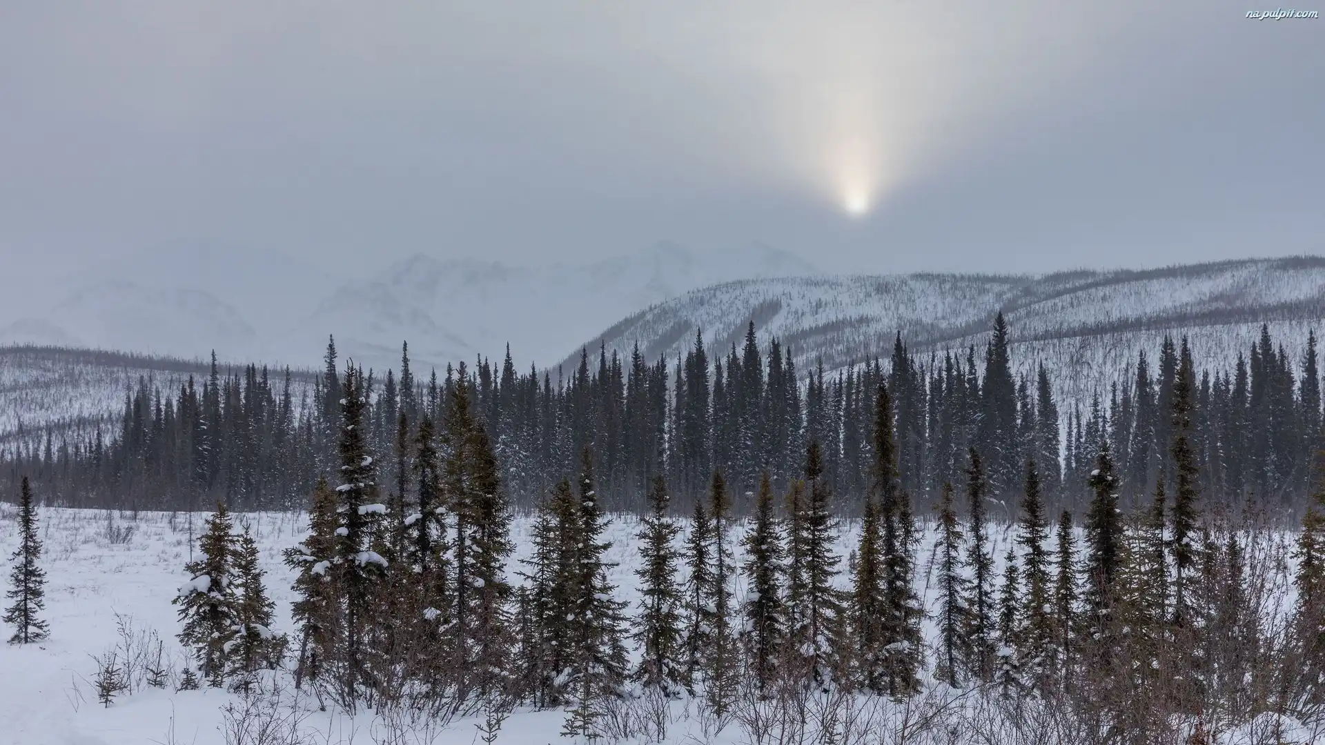 Słońce, Śnieg, Drzewa, Góry, Zamglone