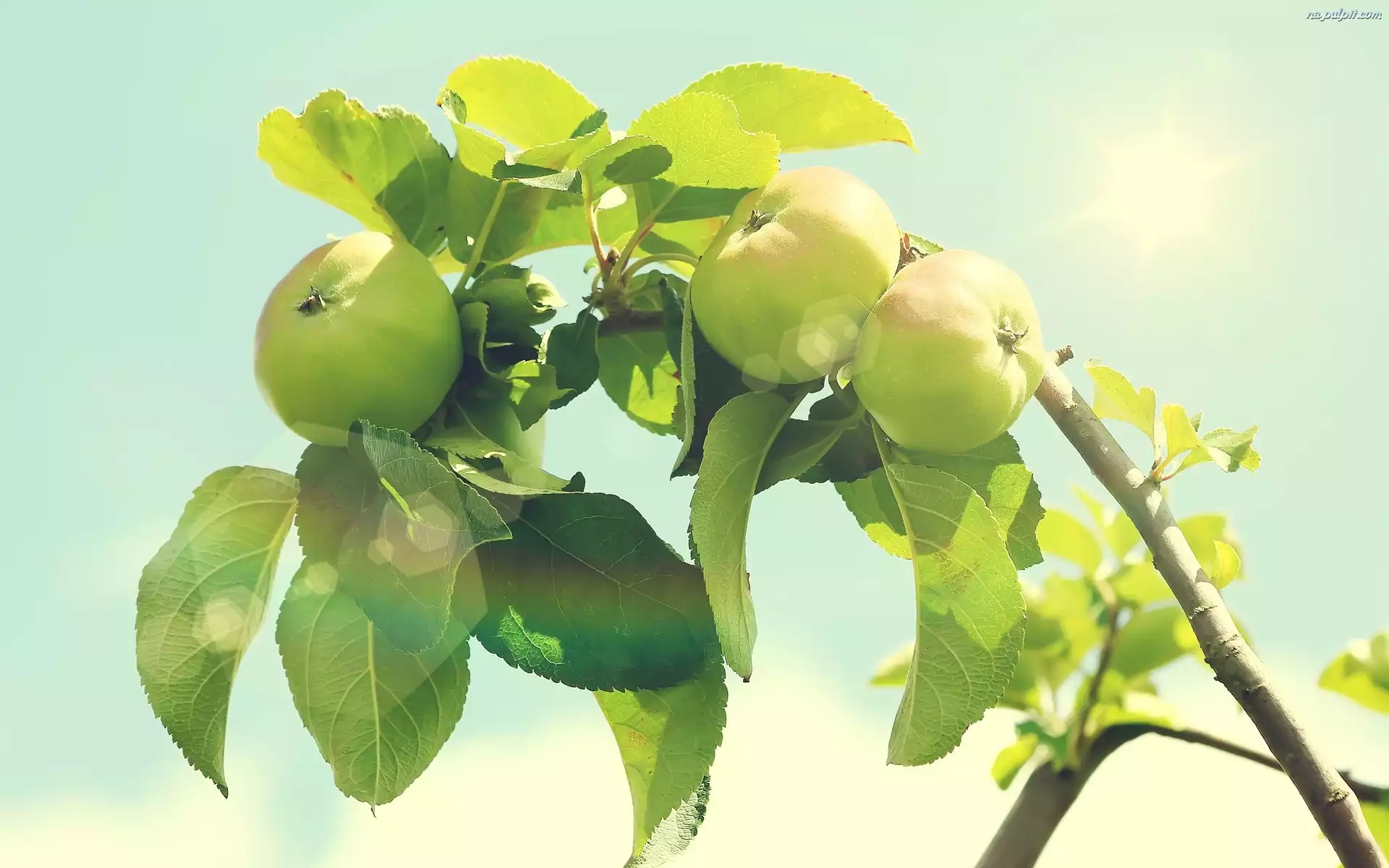 Słońce, Zielone, Gałąź, Jabłka, Listki