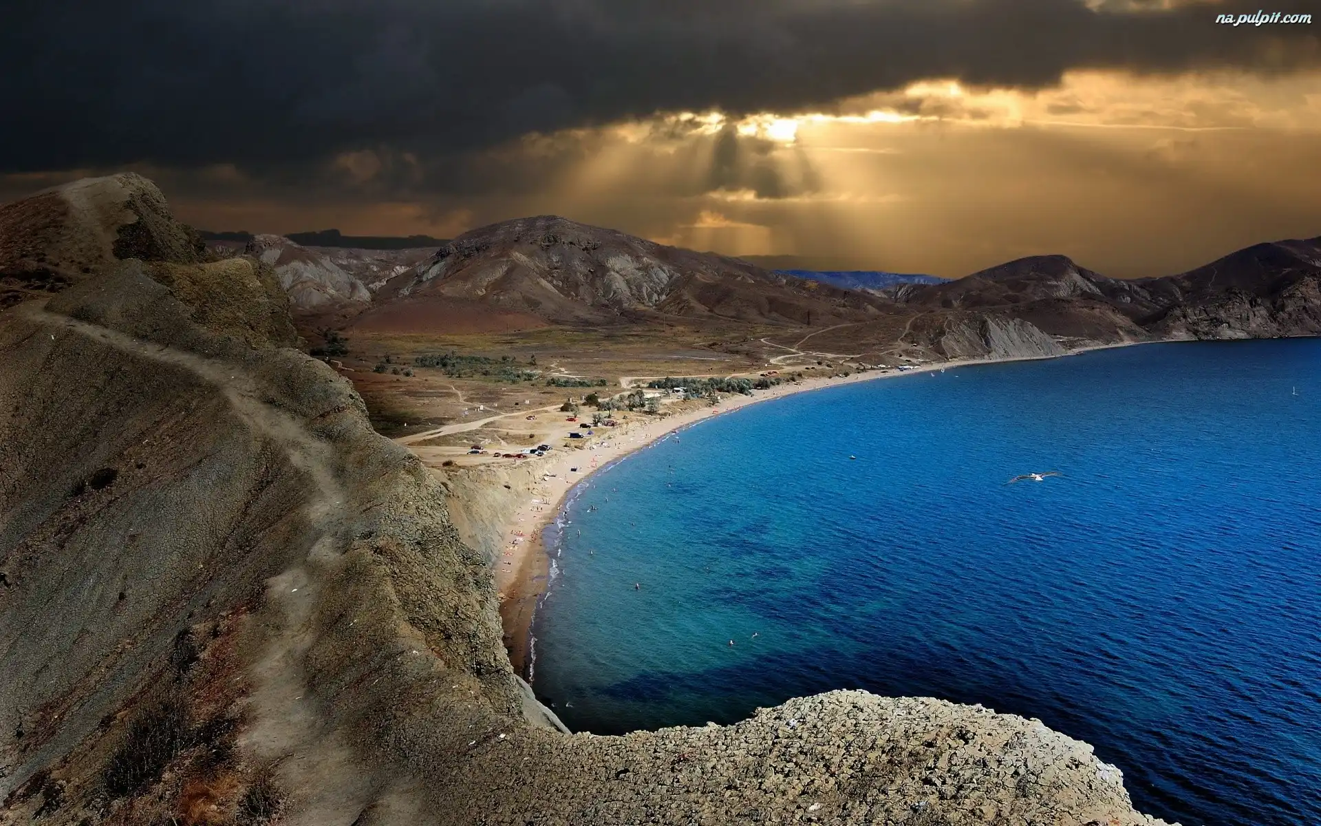 Słońce, Chmury, Wzgórza, Jezioro, Prześwitujące Na Pulpit