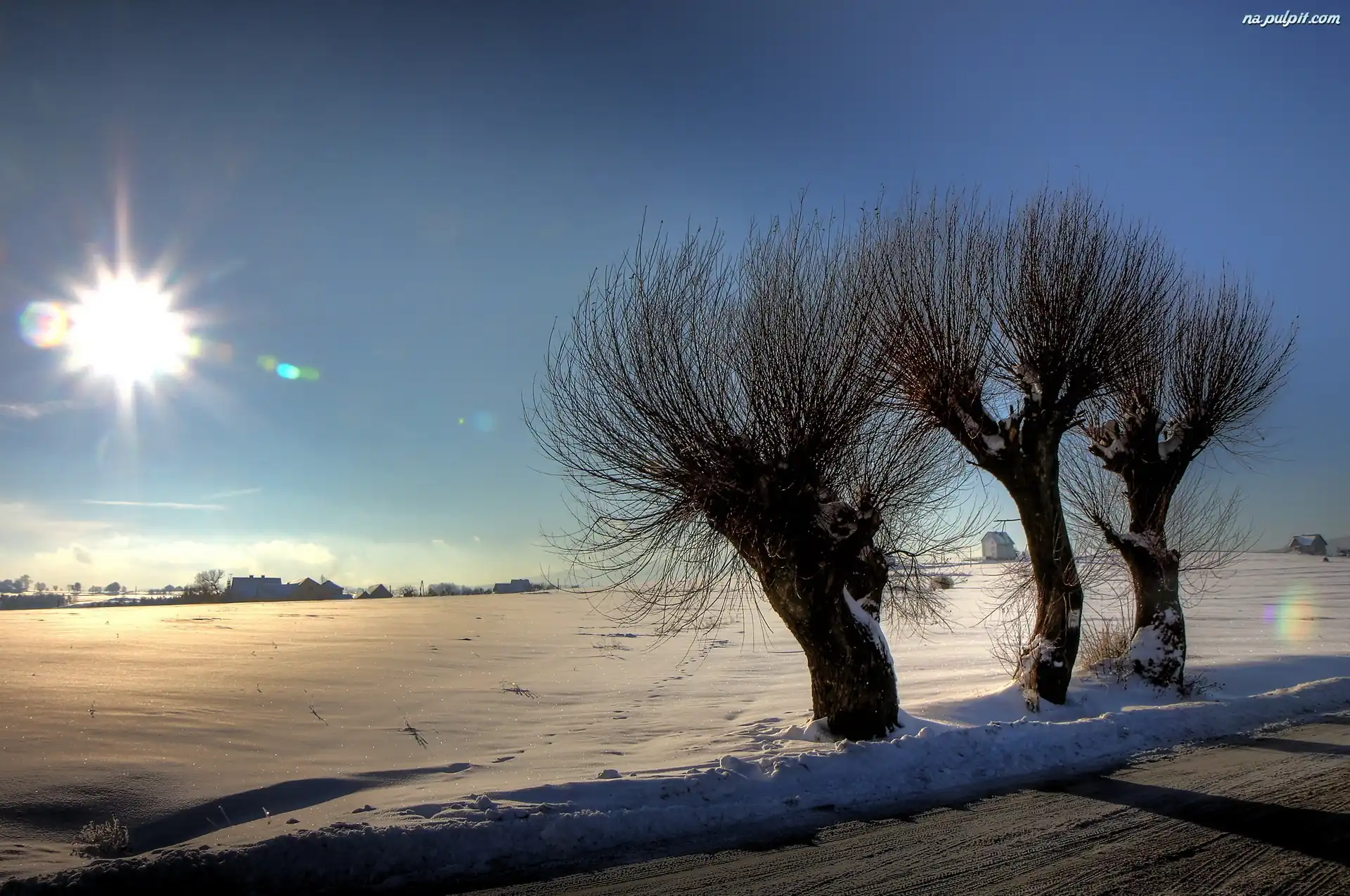 Słońce, Droga, Śnieg, Drzewa Na Pulpit