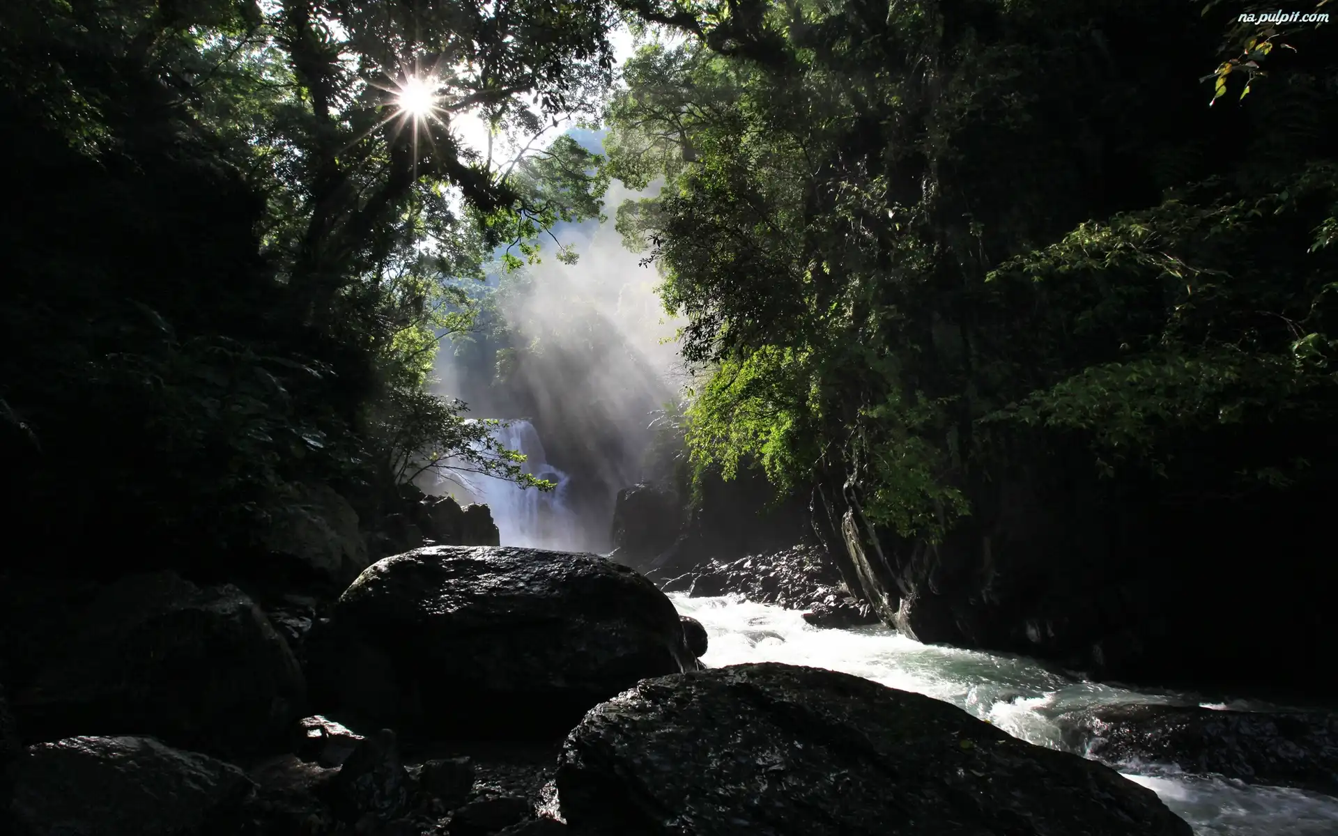 Słońce, Drzewa, Kamienie, Rzeka, Prześwitujące