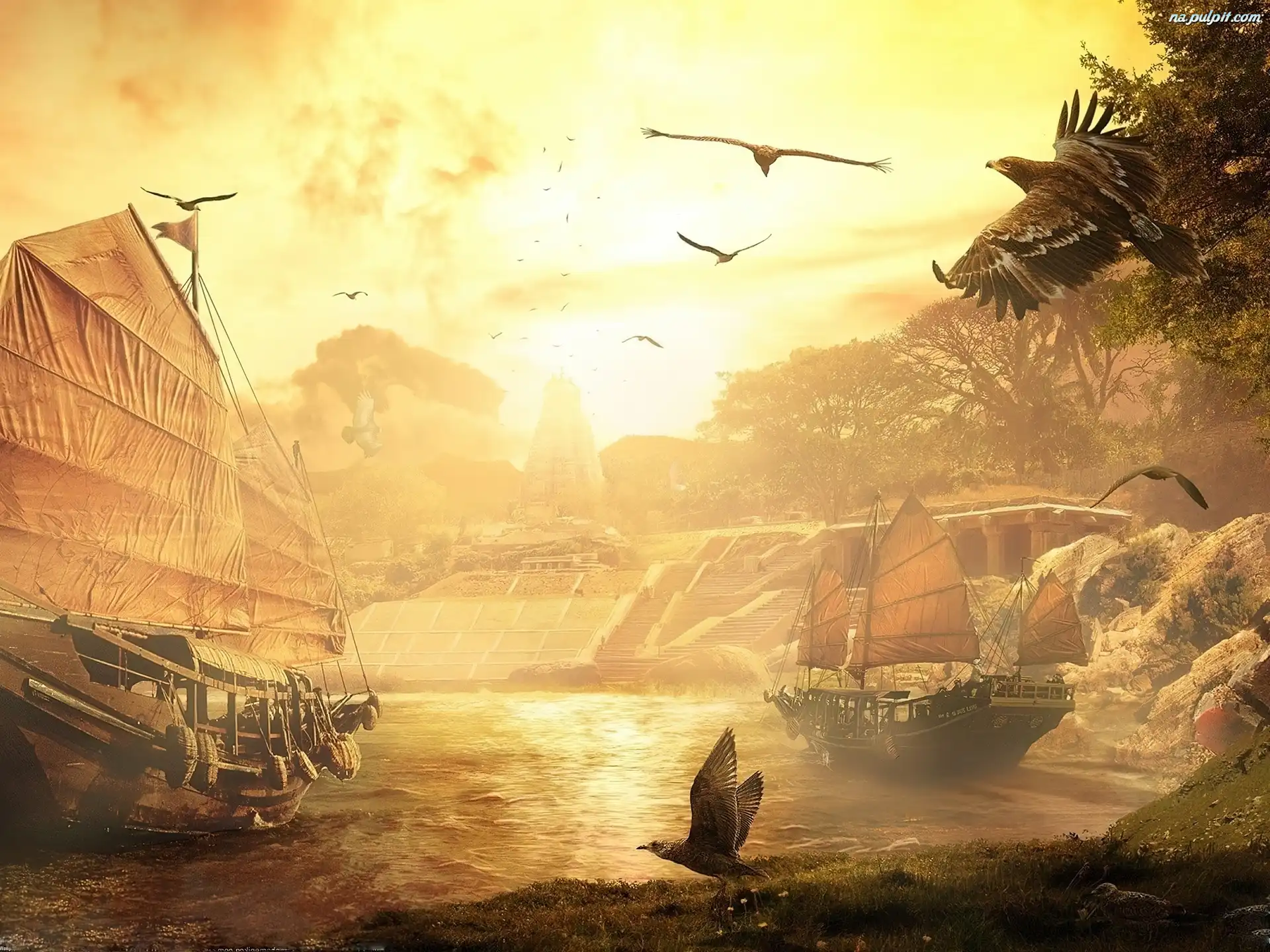 Słońce, Statki, Woda, Ptaki Na Pulpit