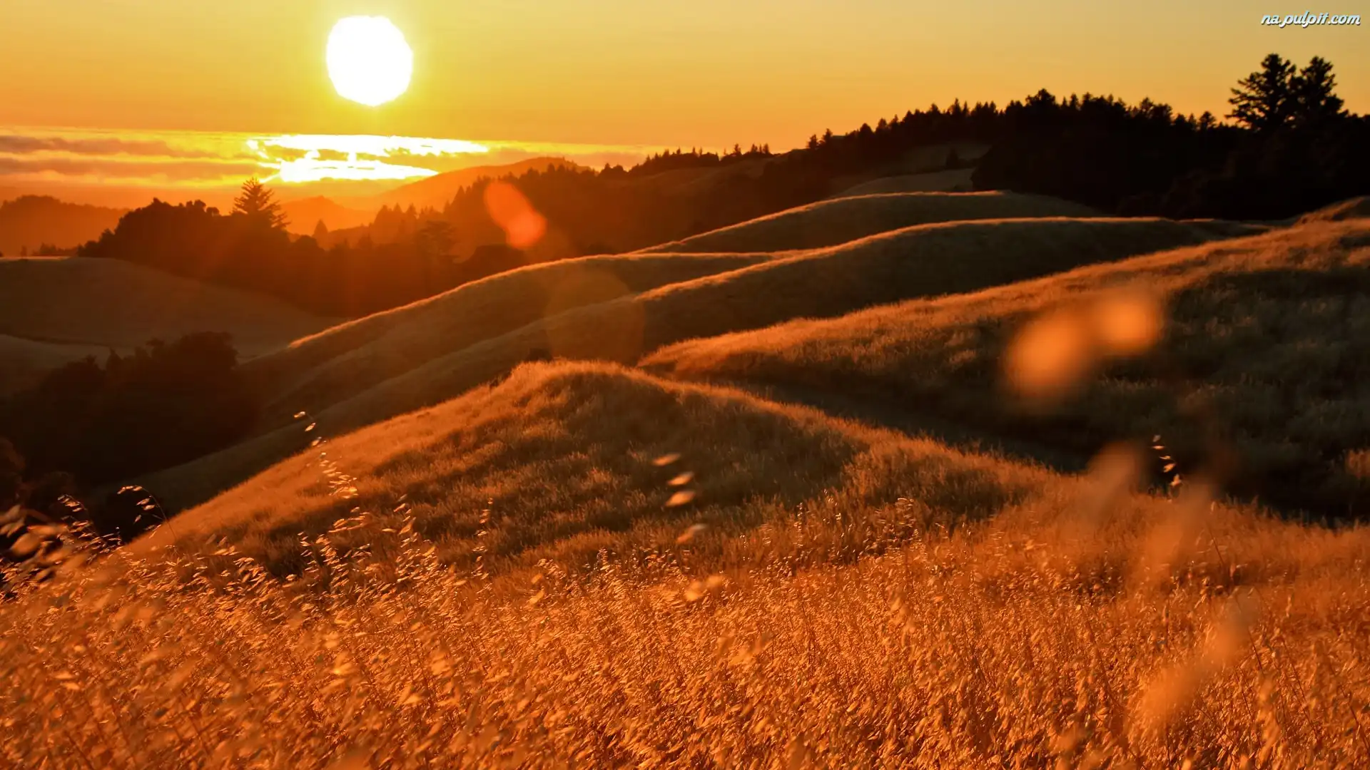 Słonce, Trawa, Góry, Promienie, Zachód, Las Na Pulpit