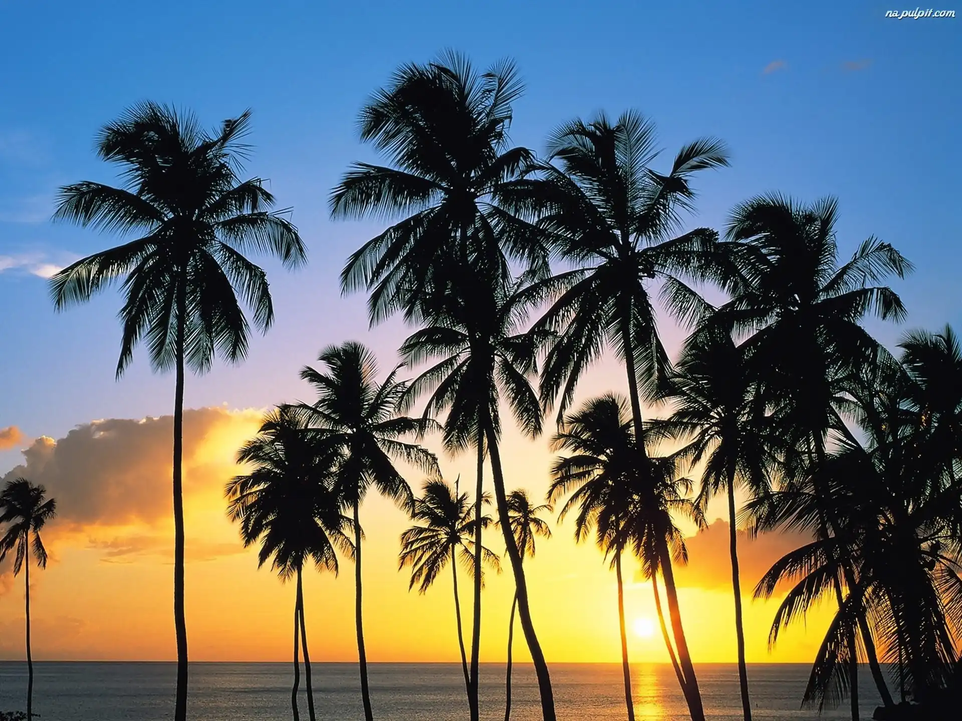 Słońce, Drzewa, Palmy, Niebo, Zachód, Chmury Na Pulpit