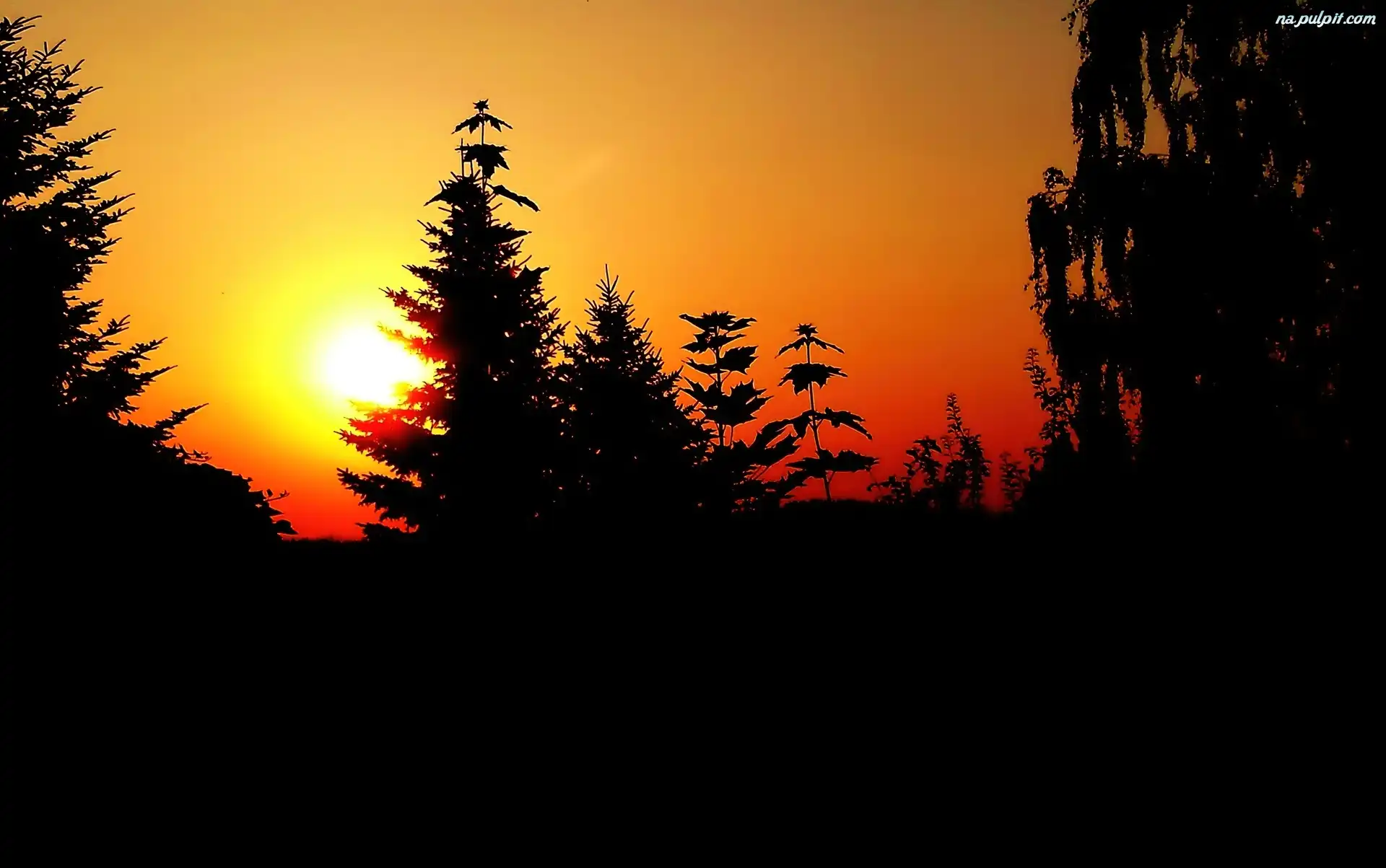 Słońce, Nad, Zachodzące, Drzewami Na Pulpit