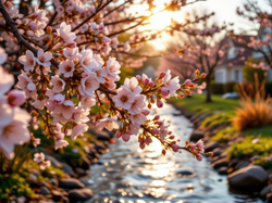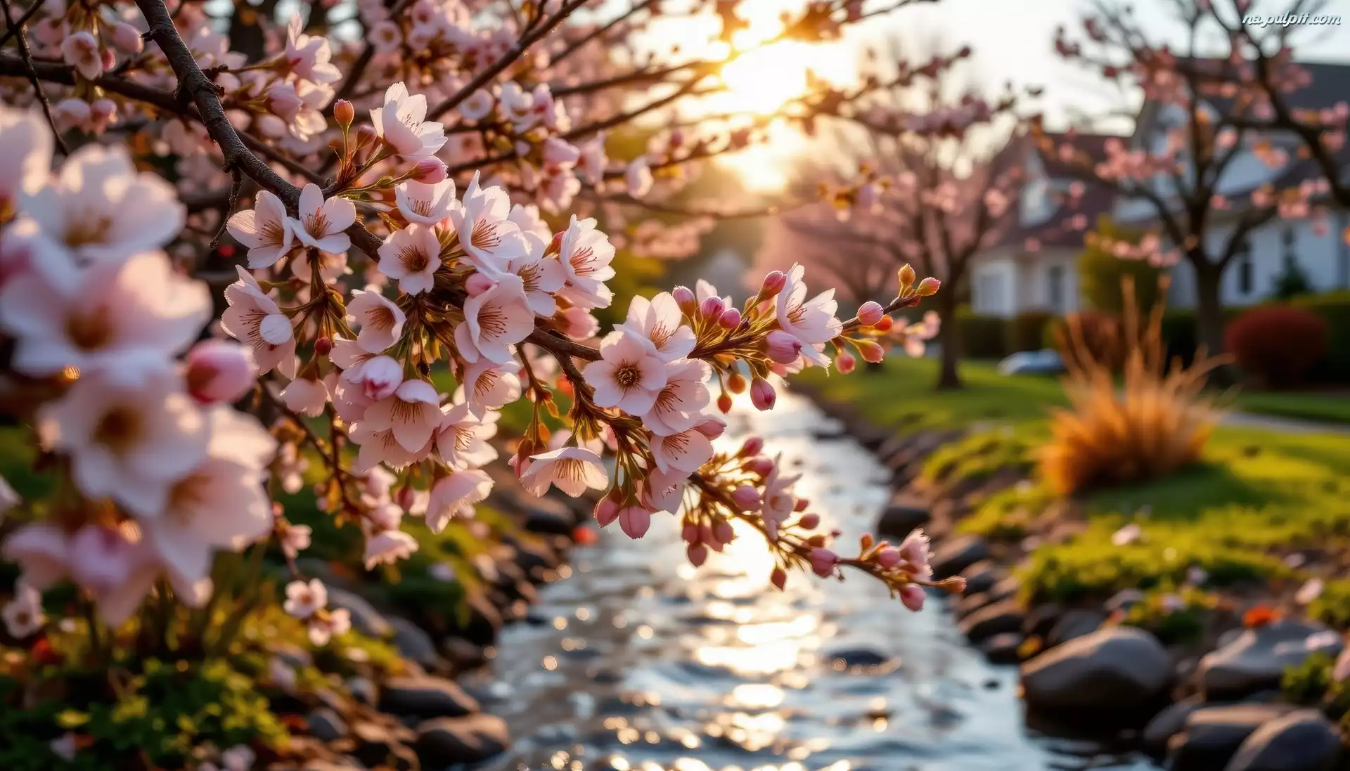 Strumyk, Drzewo owocowe, Różowe, Kwiaty, Gałązki, Światło słoneczne Na Pulpit