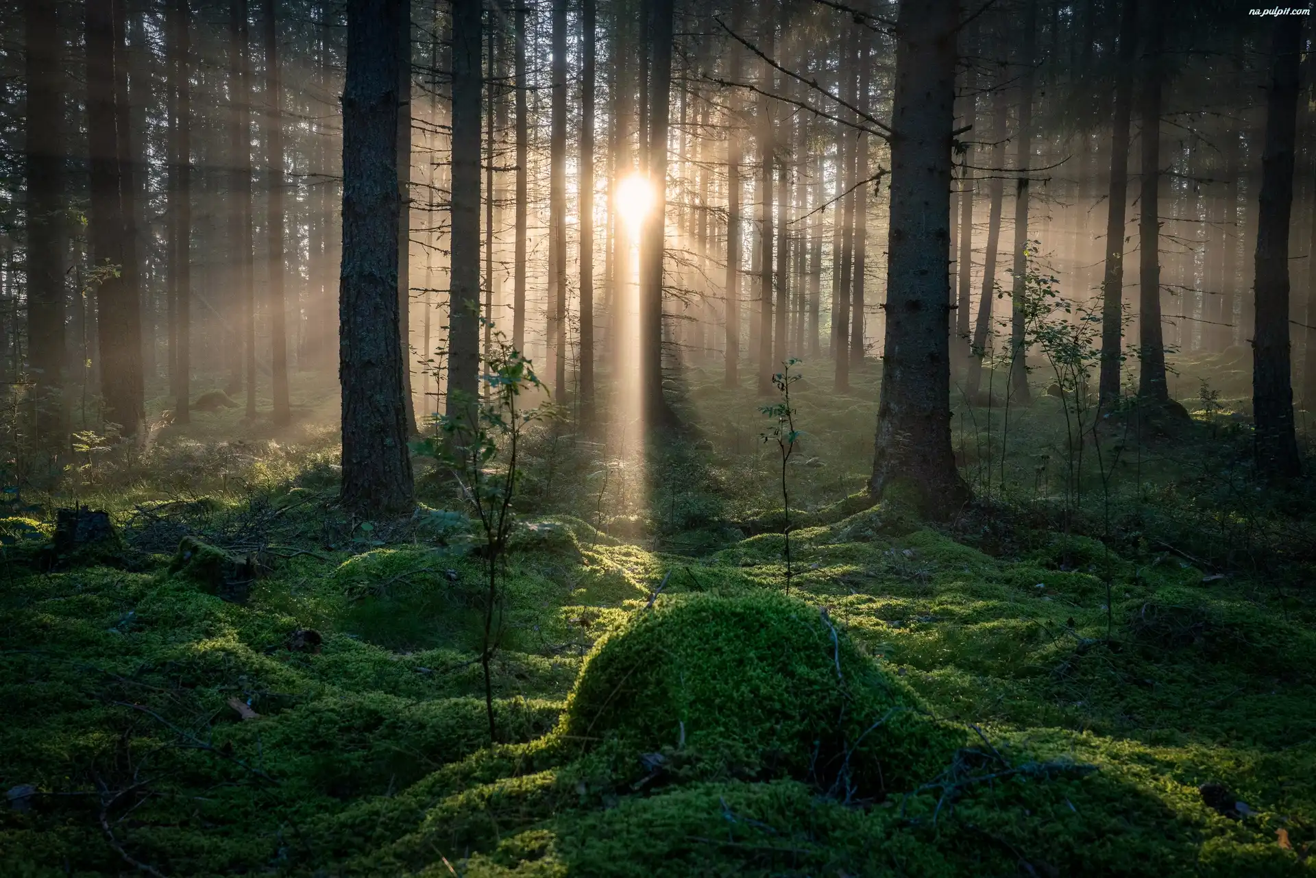 Słoneczne, Mech, Drzewa, Las, Przebijające światło