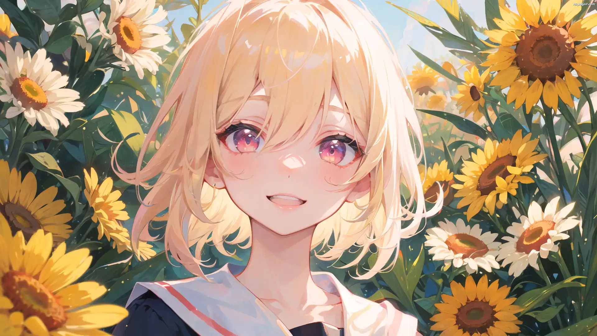 Lato, Dziewczyna, Kwiaty, Słoneczniki, Rumieniec, Anime Na Pulpit