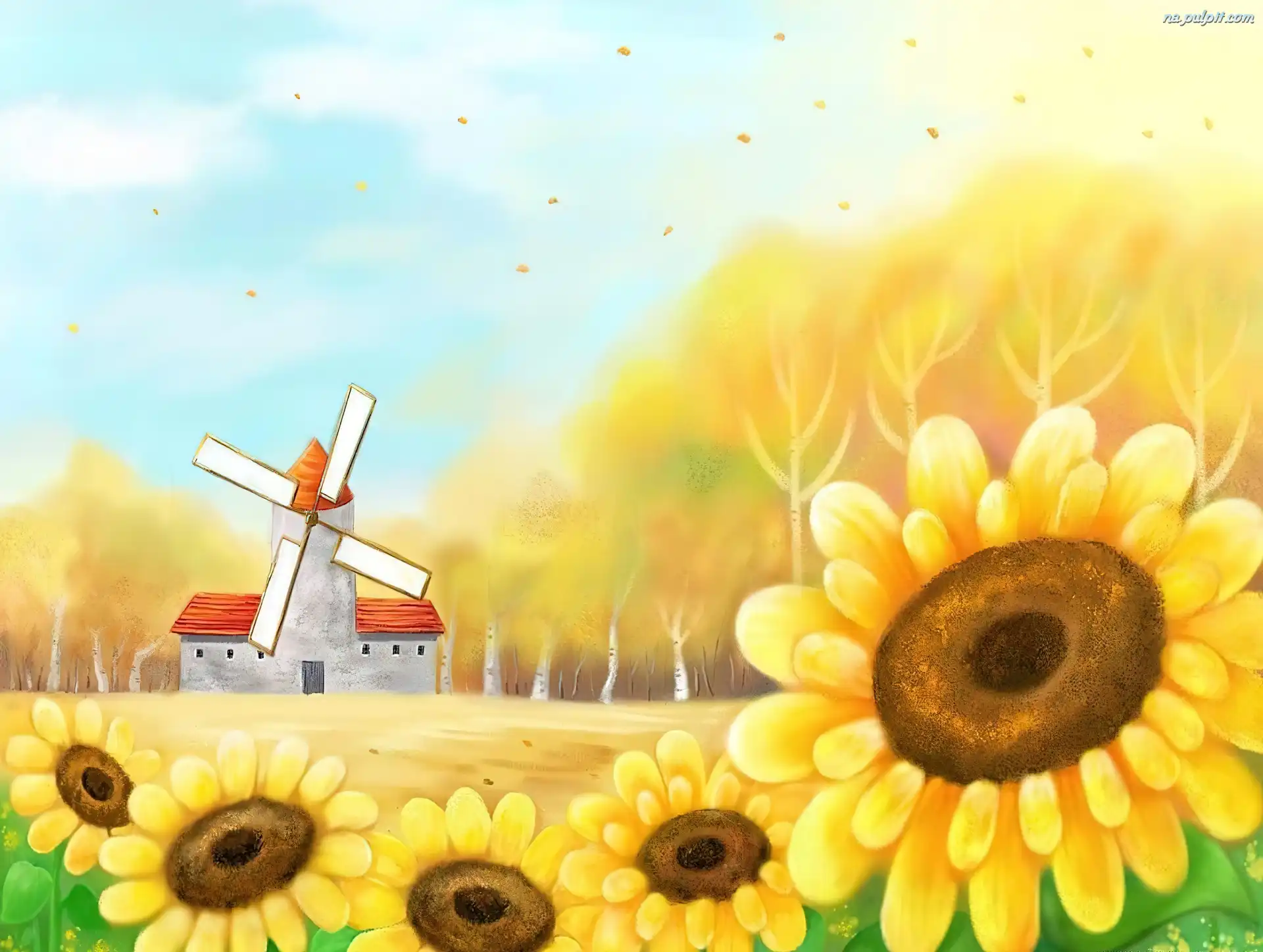 Drzewa, Słoneczniki, Wiatrak Na Pulpit