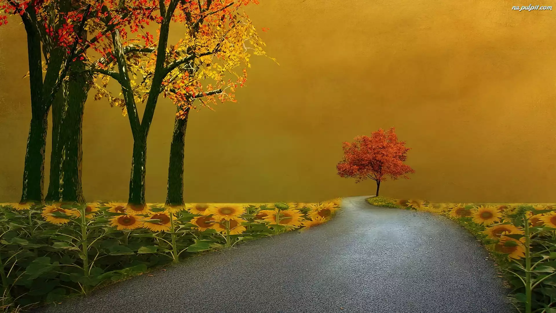 Słoneczniki, Droga, Grafika, Drzewa Na Pulpit