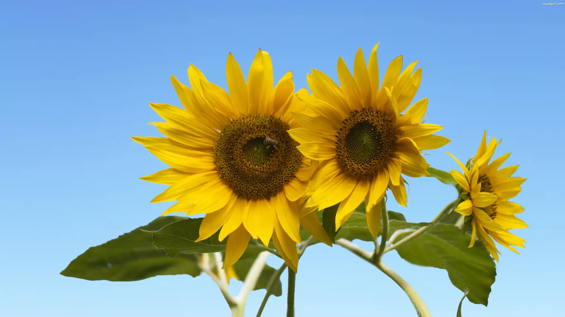 Kwiaty, Słoneczniki, Płatki, Niebo, Liście Na Pulpit