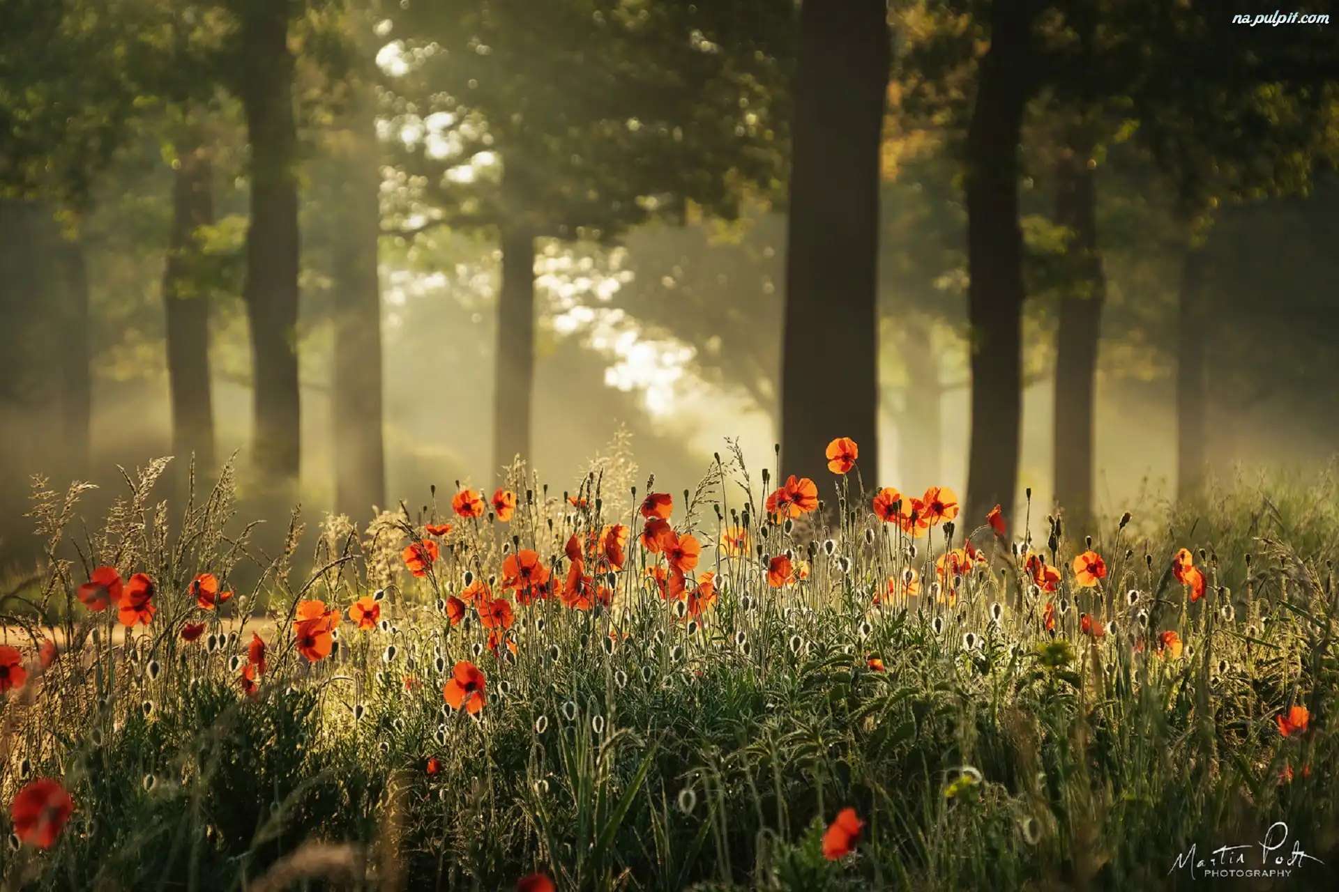 Słoneczny blask, Las, Maki, Mgła Na Pulpit