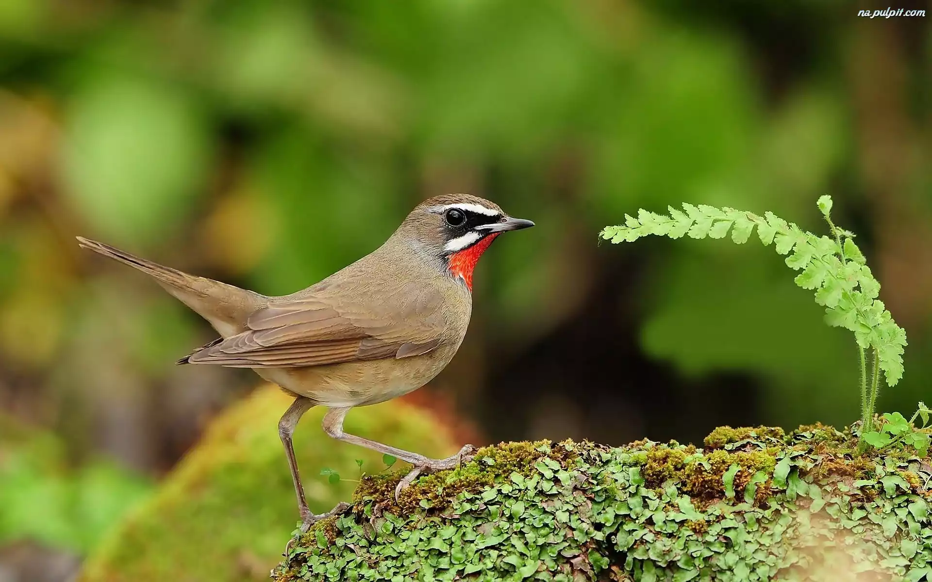 Ptak, Słowiczek rubinowy, Kamień, Paproć Na Pulpit