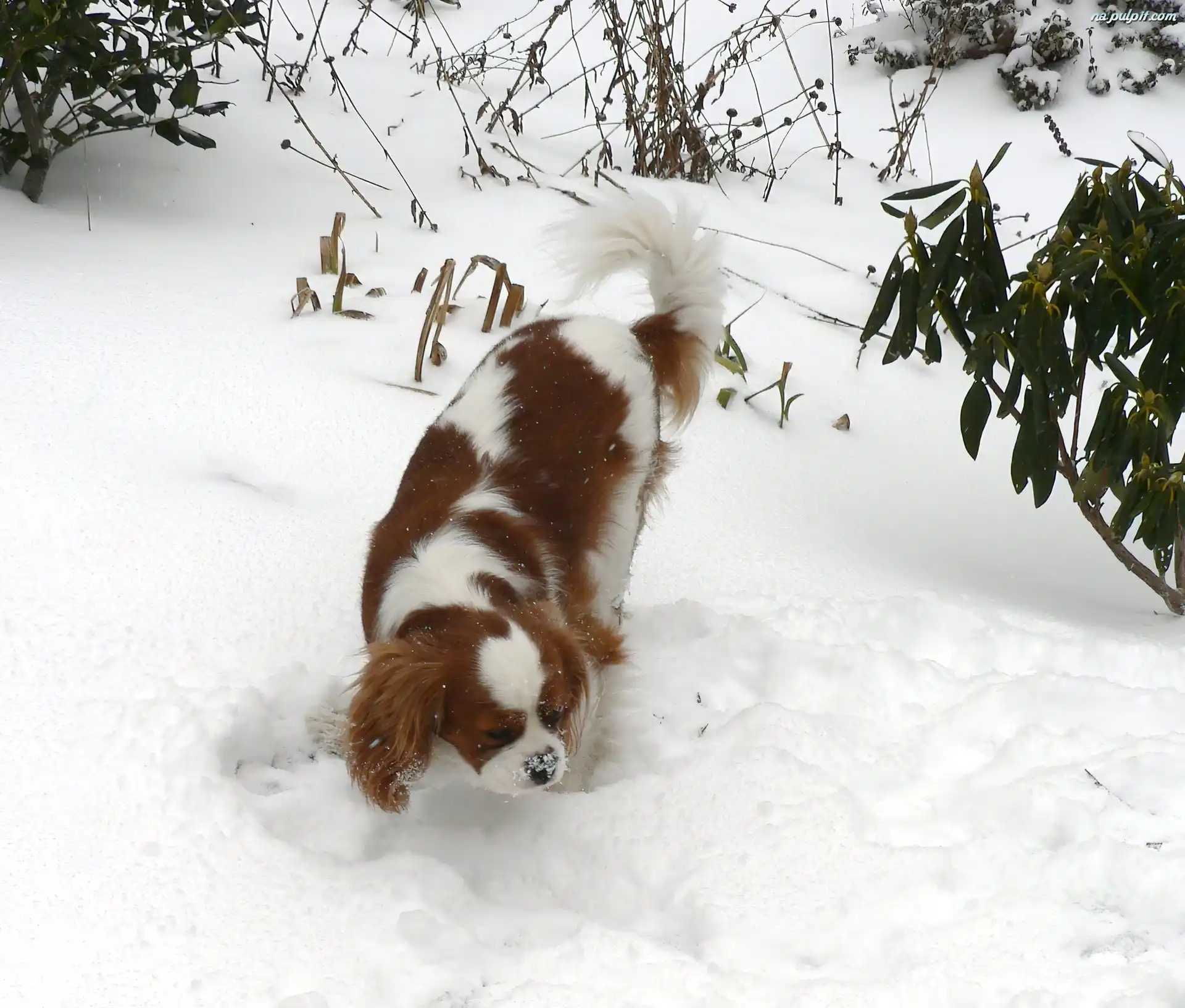 śnieg, Rudo-biały, King Charles Spaniel Na Pulpit