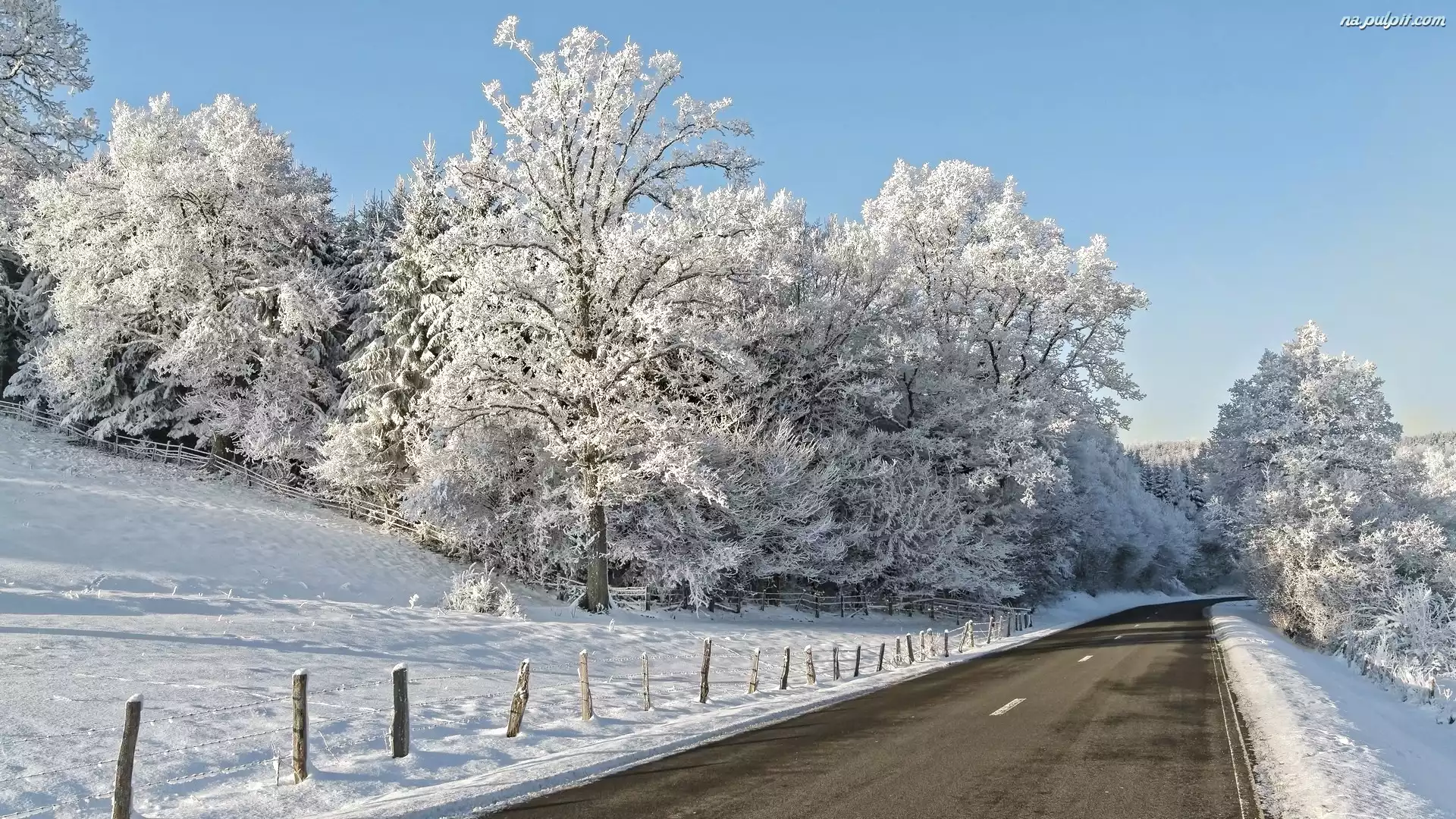 Oszronione, Droga, Zima, Åšnieg, Ogrodzenie, Drzewa