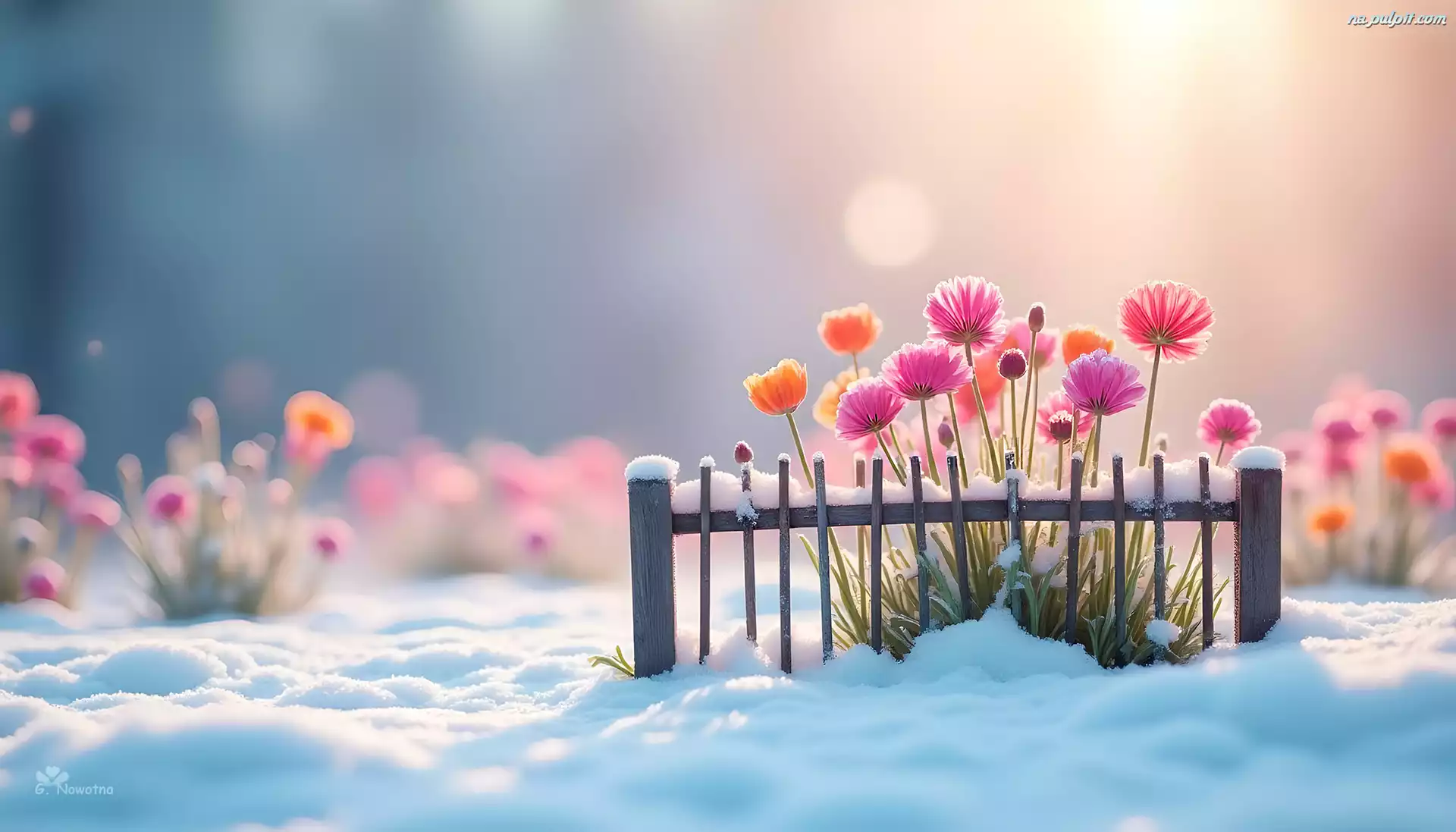 Zima, Kolorowe, Płotek, Śnieg, Kwiaty, Grafika Na Pulpit