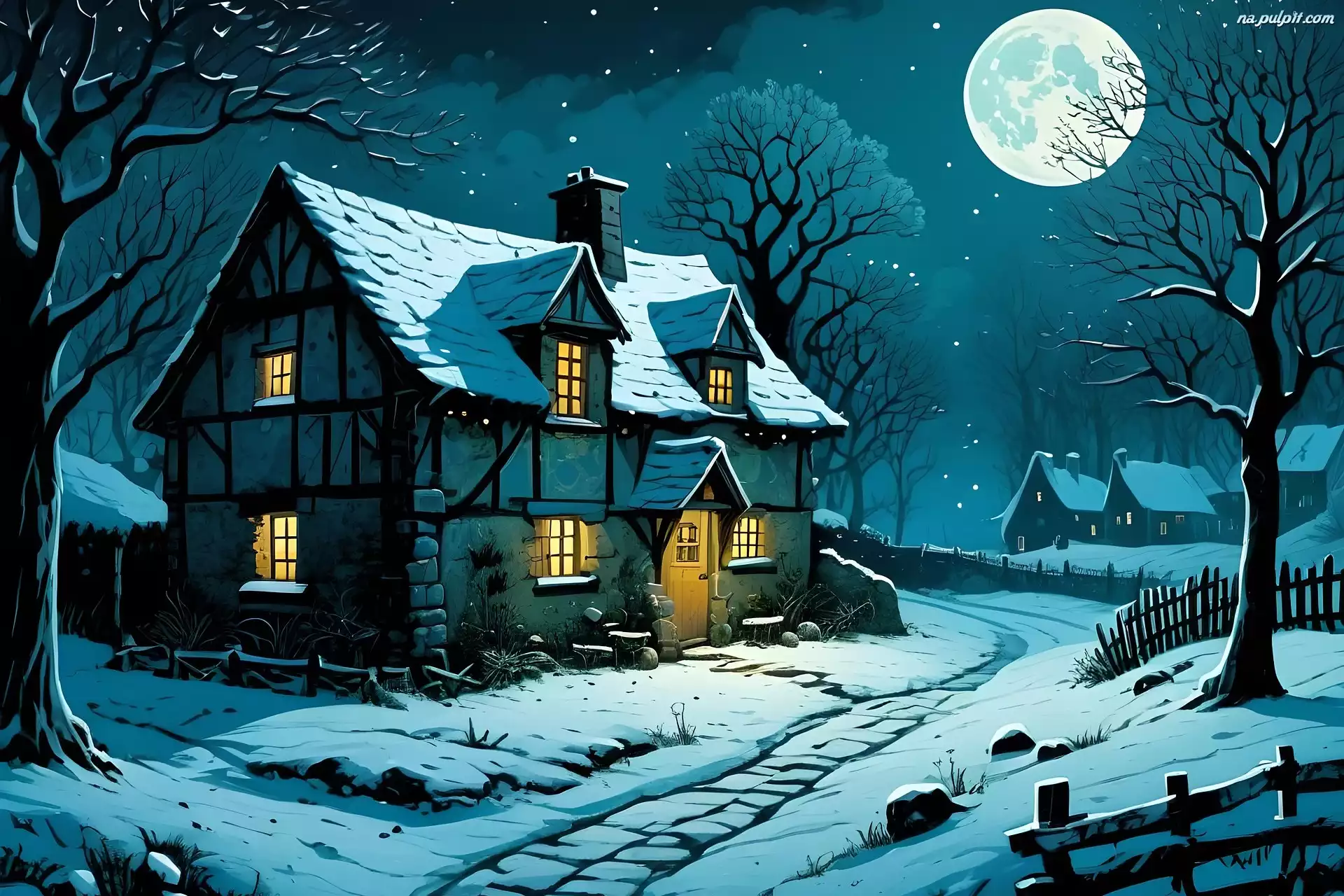 Drzewa, Światła, Księżyc, Zima, Grafika, Noc, Domy, Śnieg Na Pulpit