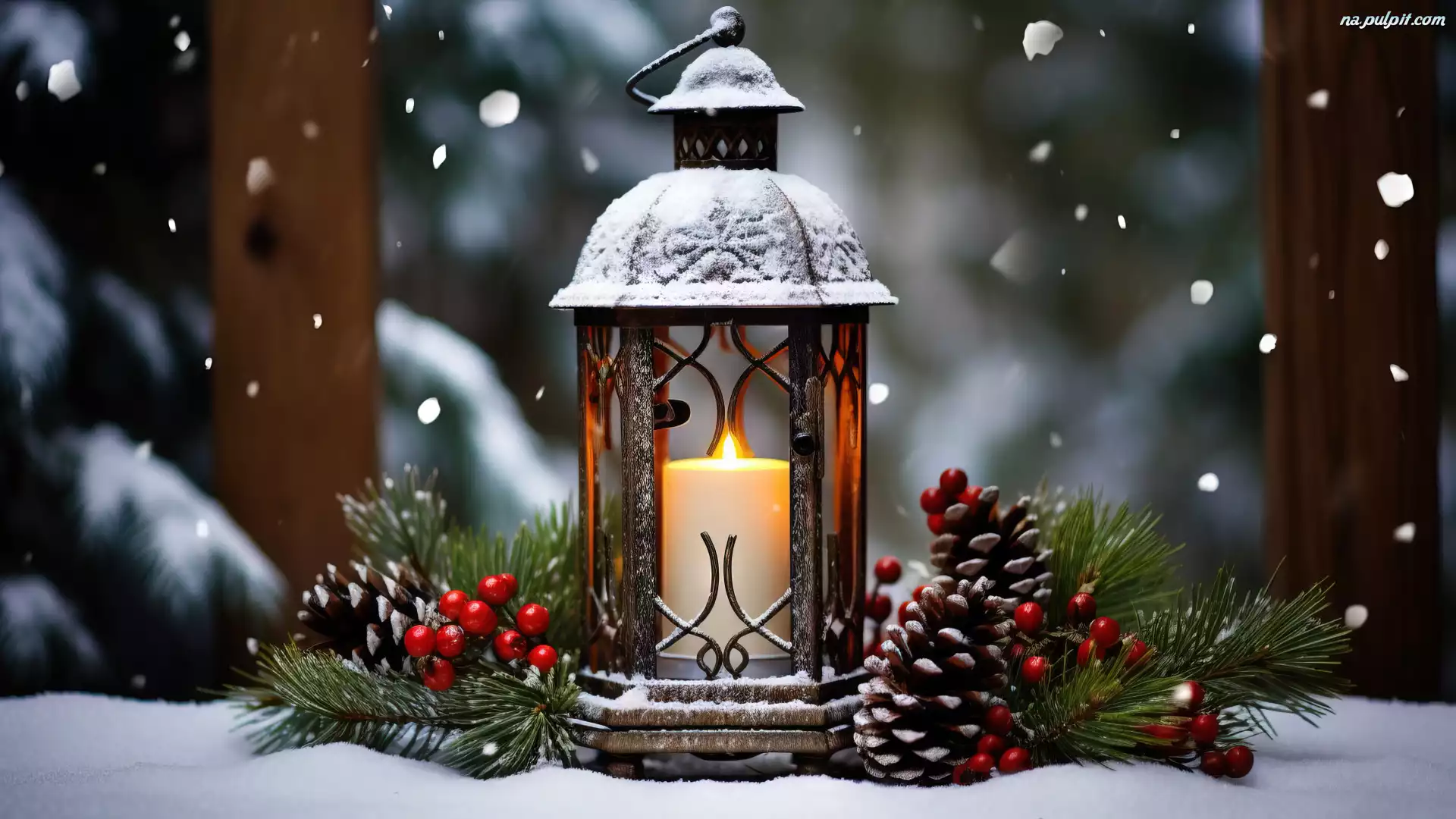 Gałązki, Śnieg, Lampion, Szyszki, Świeca Na Pulpit
