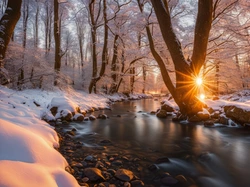 Promienie słońca, Rzeka, Drzewa, Zima, Las, Oszronione, Śnieg