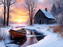 Śnieg, Rzeka, Drzewa, Zima, AI, Zachód słońca, Dom, Łódź
