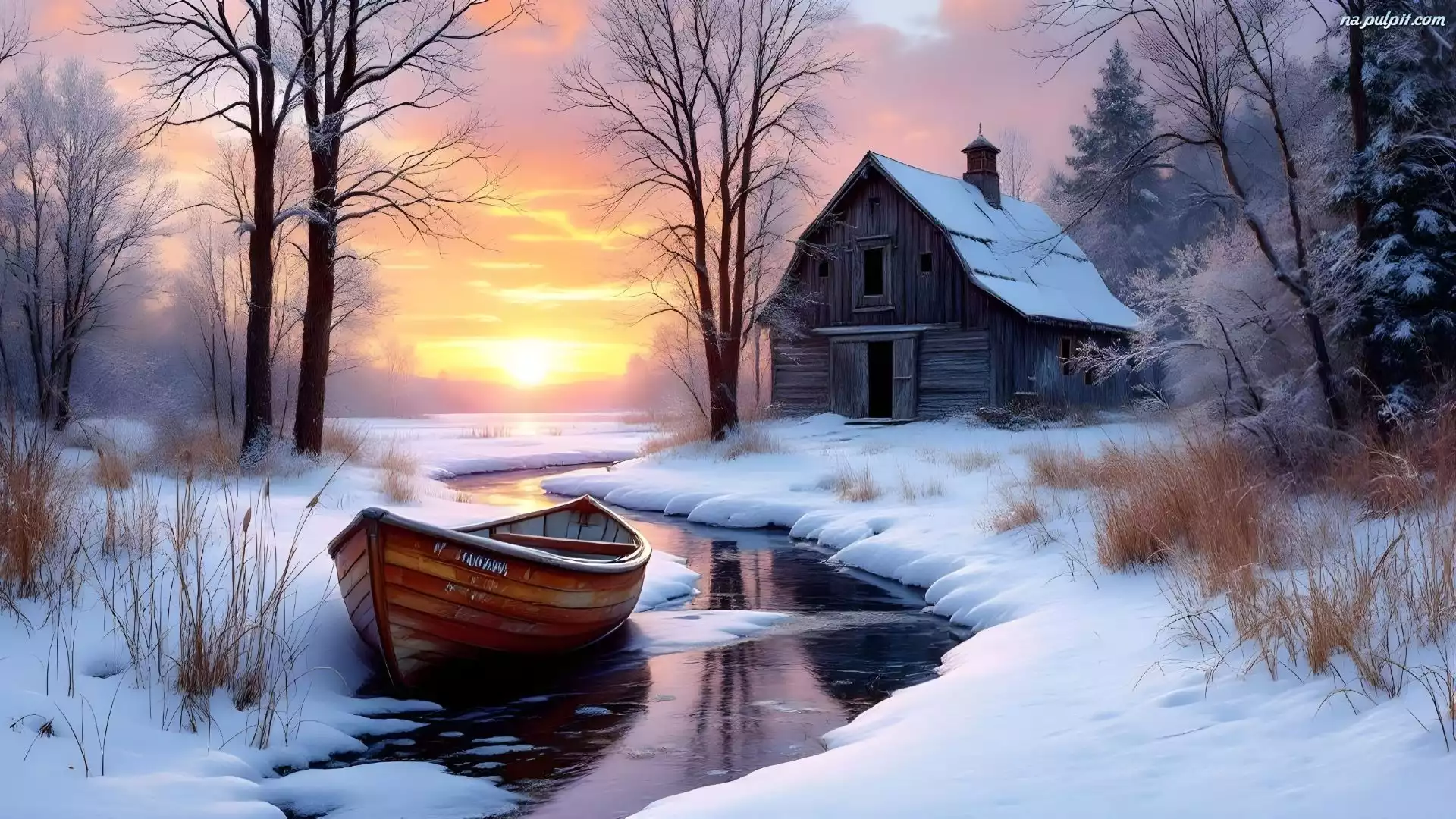 Śnieg, Rzeka, Drzewa, Zima, AI, Zachód słońca, Dom, Łódź Na Pulpit