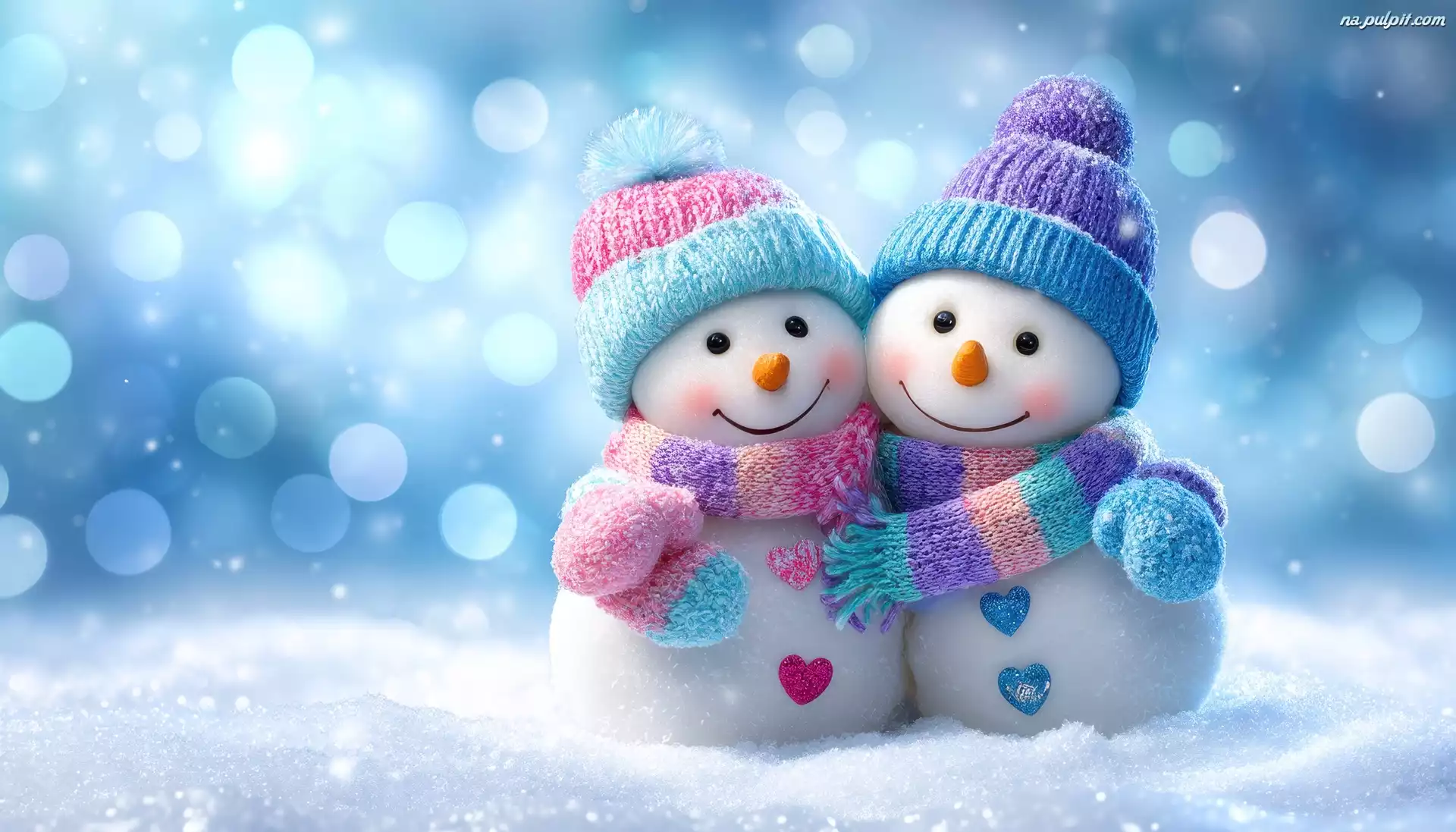 Grafika AI, Szaliki, Czapki, Dwa, Bałwanki, Kolorowe, Śnieg Na Pulpit
