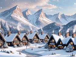 Wioska, Domy, Góry, Śnieg