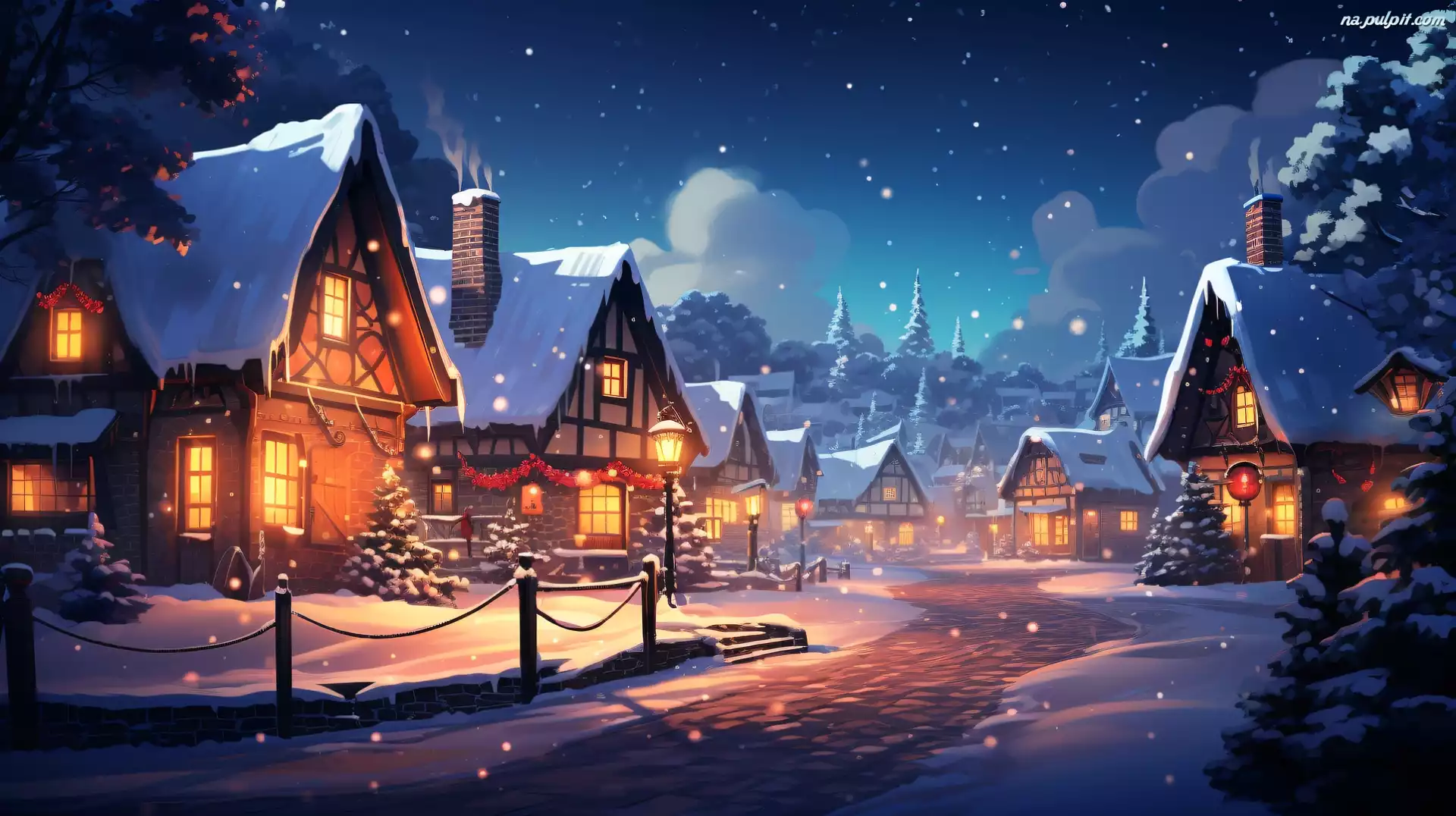 Śnieg, Grafika, Noc, Domy, Choinki, Oświetlone, Zima, Droga, Latarnia Na Pulpit