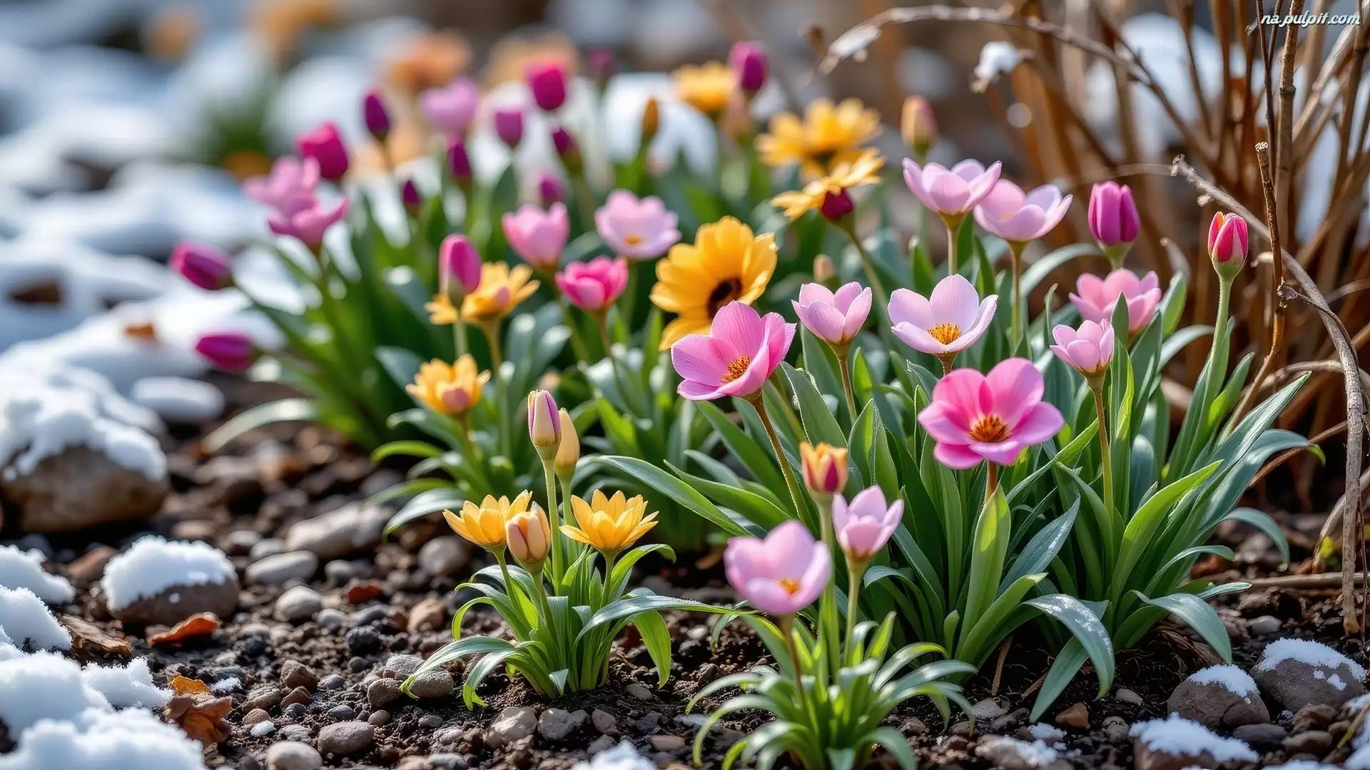 Żółte, Różowe, Kwiaty, Śnieg Na Pulpit