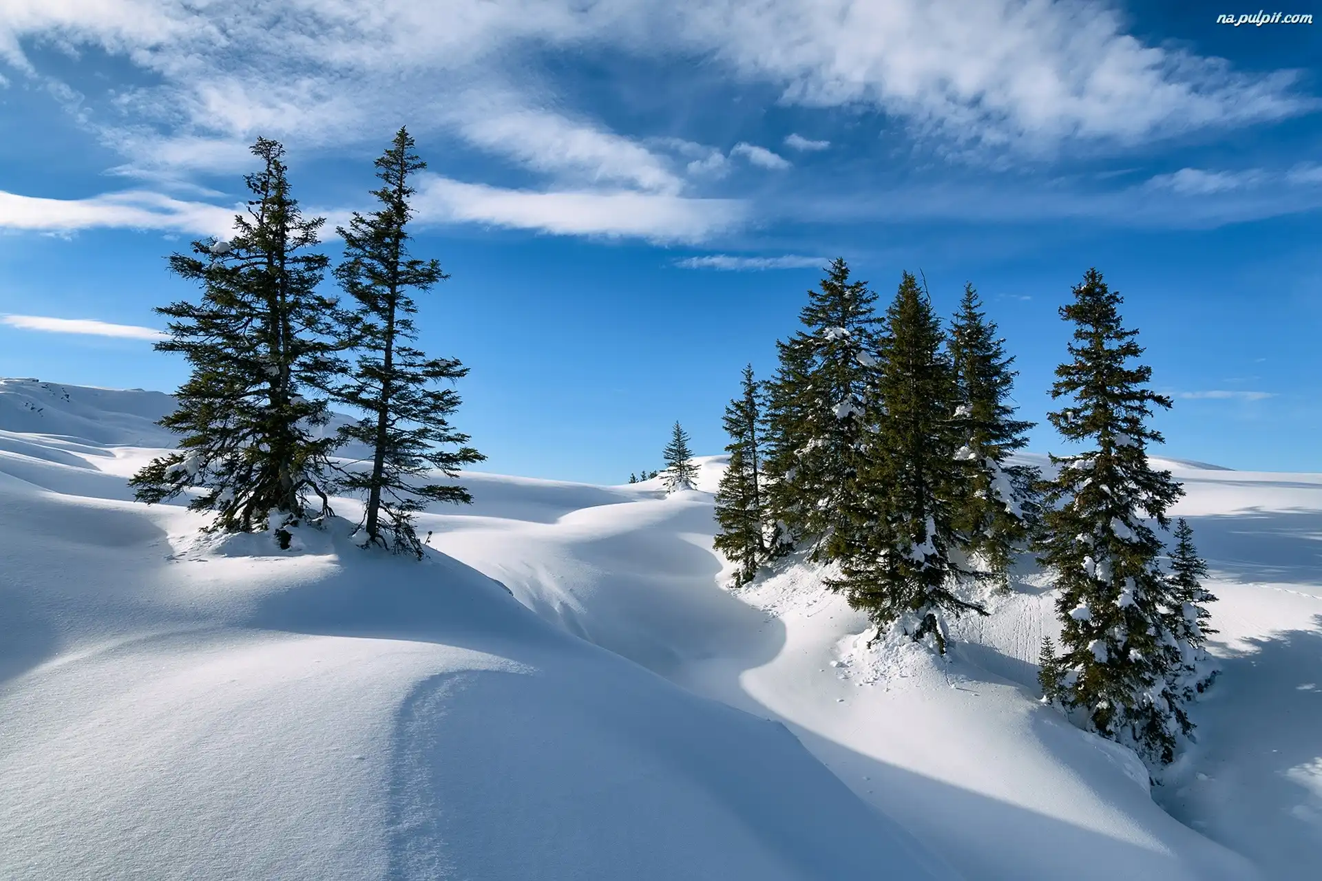 Zaspy śnieżne, Drzewa, Świerki, Śnieg, Zima, Góry
