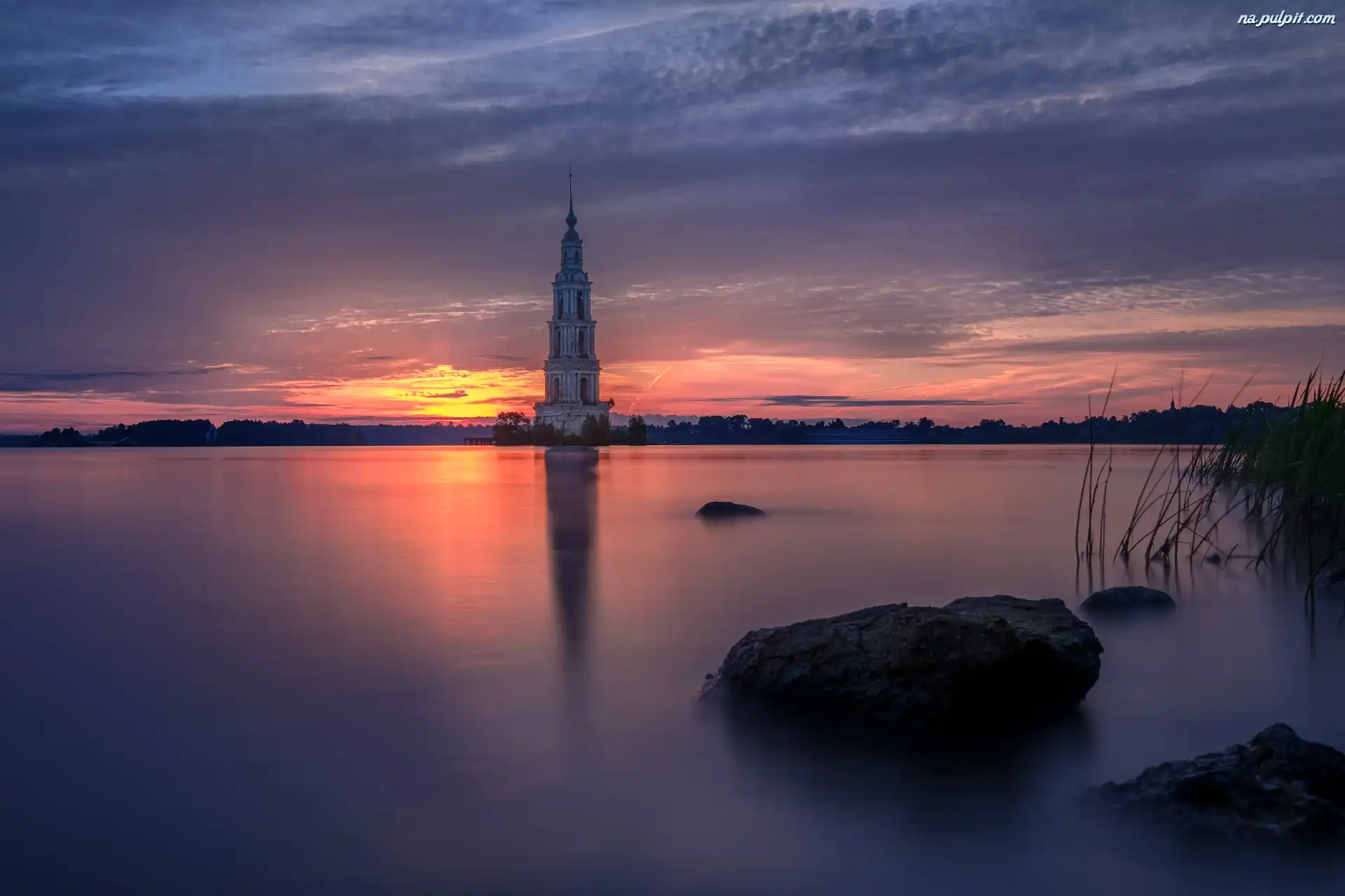Sobór św. Mikołaja, Kościół, Kalazin, Odbicie, Jezioro, Zbiornik Uglicki, Trawa, Obwód twerski, Rosja, Kamienie, Dzwonnica, Zachód słońca Na Pulpit |