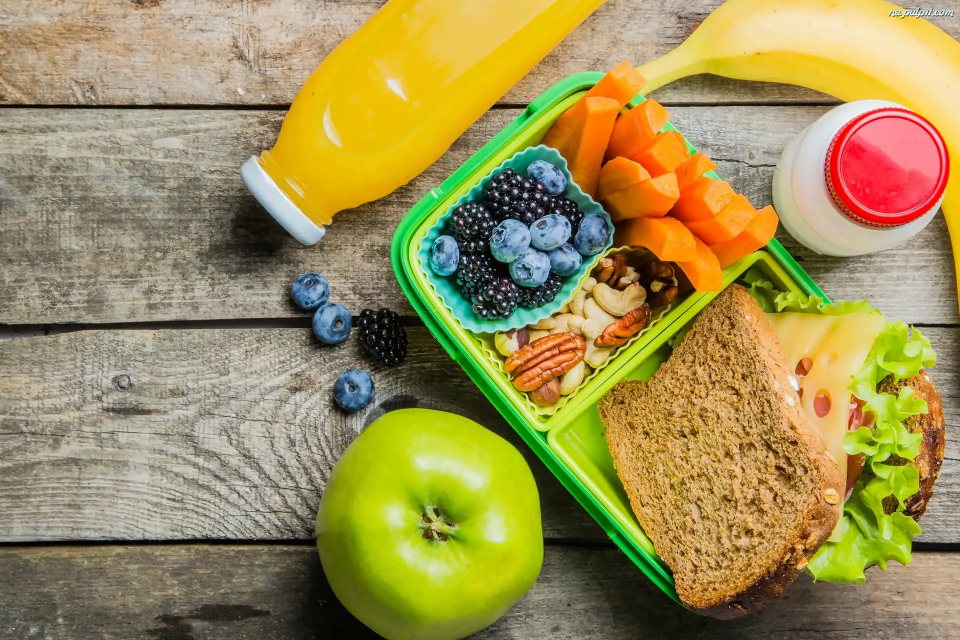 Deski, Marchewka, Banan, Jabłko, Śniadanie, Pojemnik, Chleb, Jagody, Sok Na Pulpit
