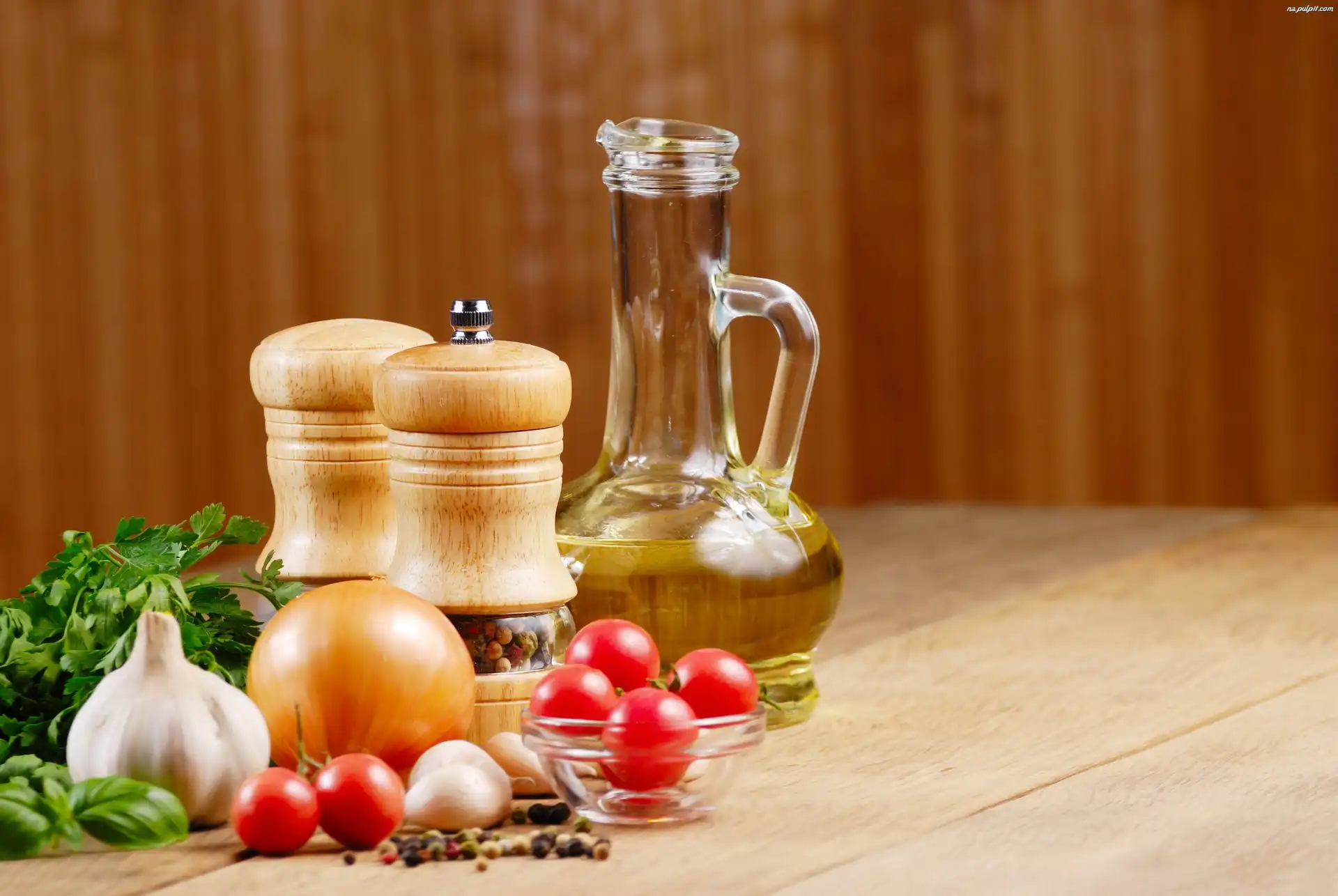 Sól, Cebulka, Czosnek, Pieprz, Olej, Pomidorki