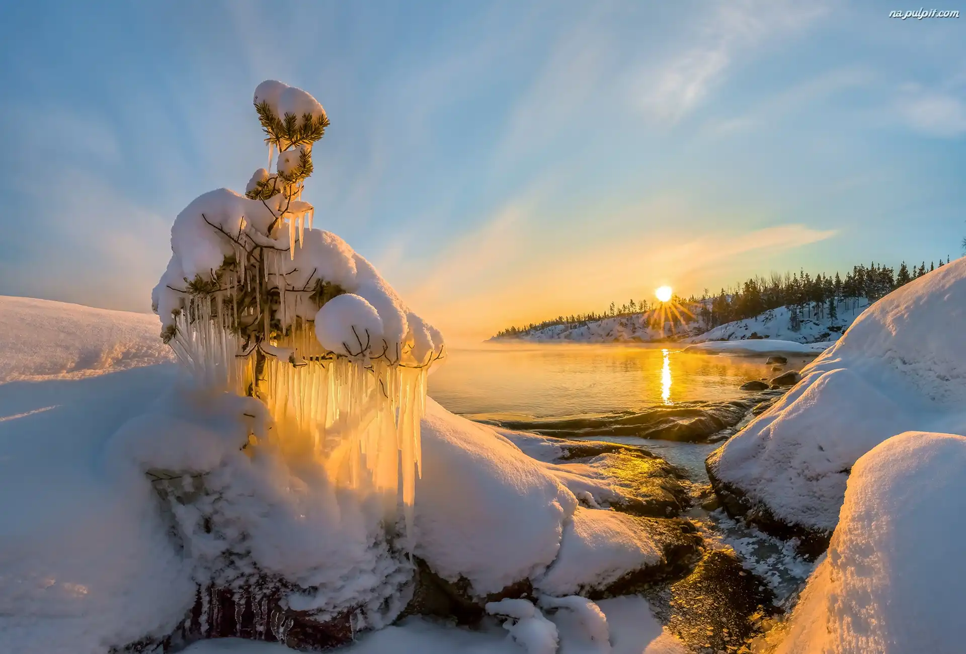 Jezioro, Sople, Promienie słońca, Zaśnieżone, Zima, Drzewko Na Pulpit