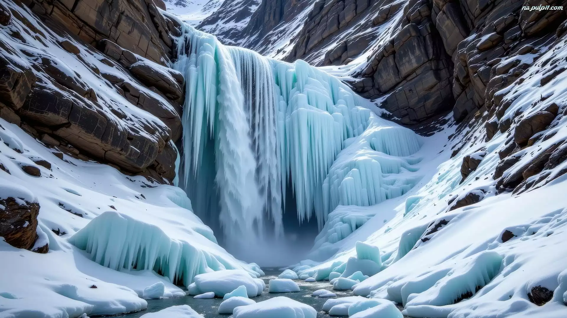 Rzeka, Skały, Wodospad, Sople, Oblodzony, Zima Na Pulpit