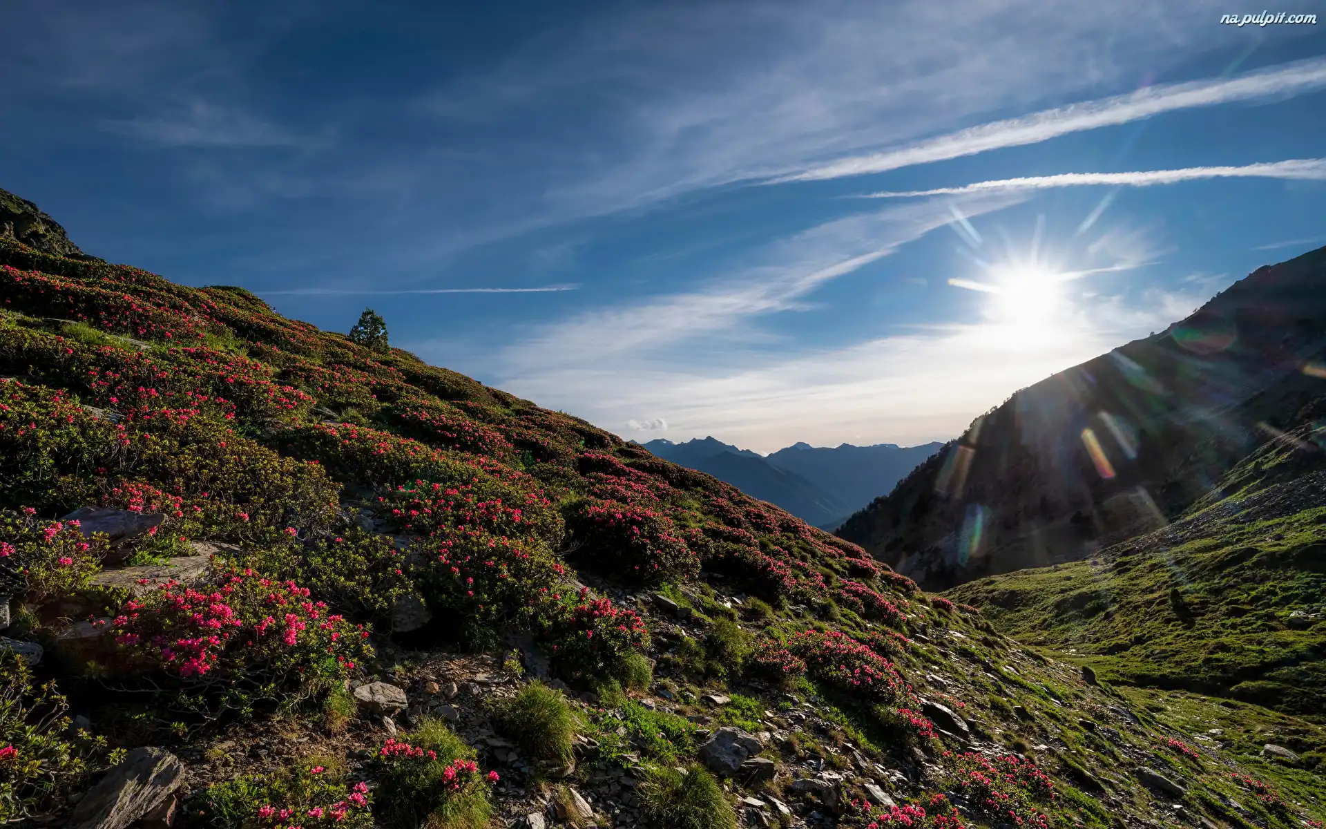 Park Narodowy Vall de Sorteny, Pireneje, Wschód słońca, Kwiaty, Ordino, Andora, Łąka, Góry, Roślinność Na Pulpit |