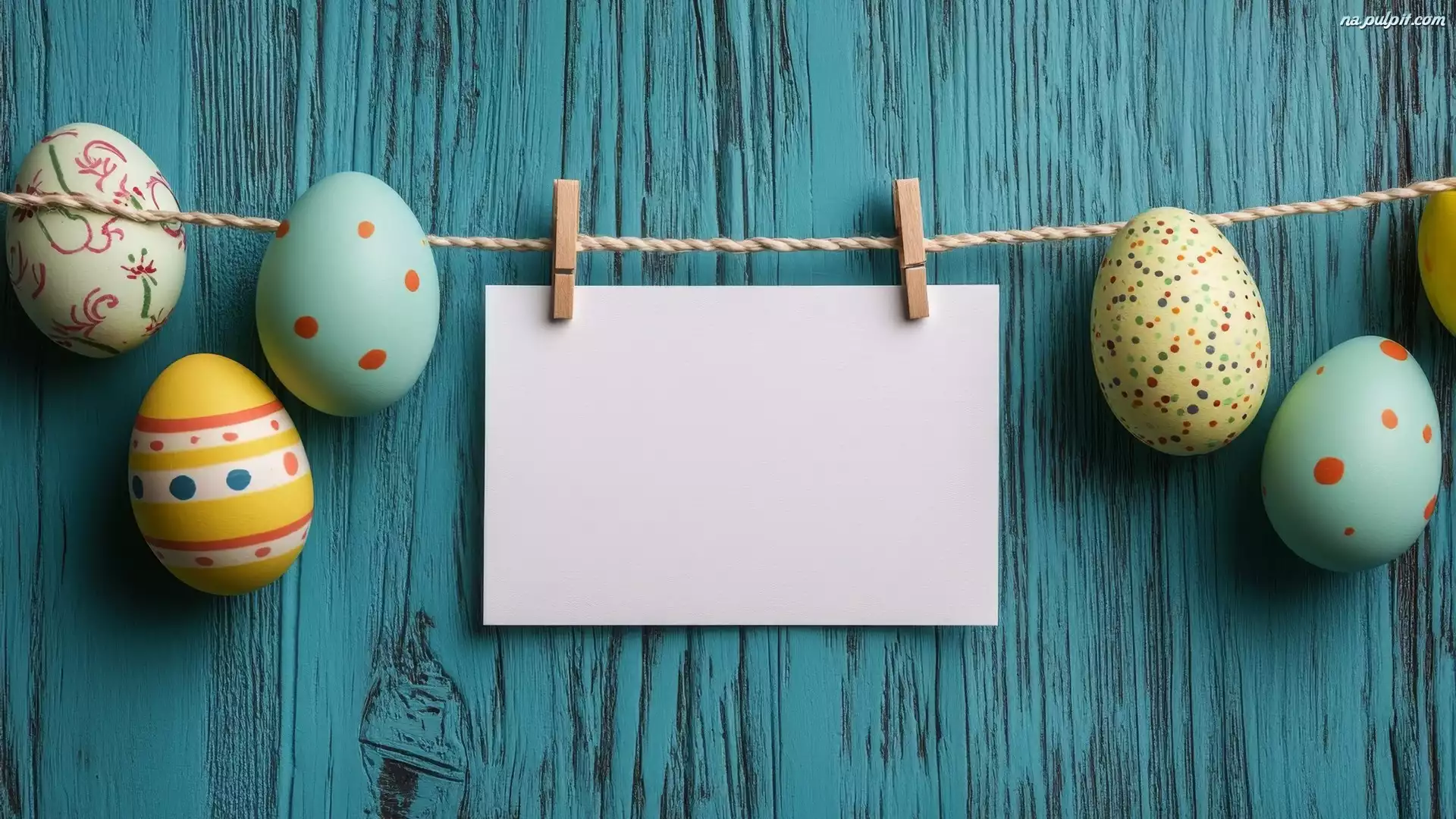 Biała, Sznurek, Kartka, Wielkanoc, Tło, Niebieskie, Pisanki, Spinacze