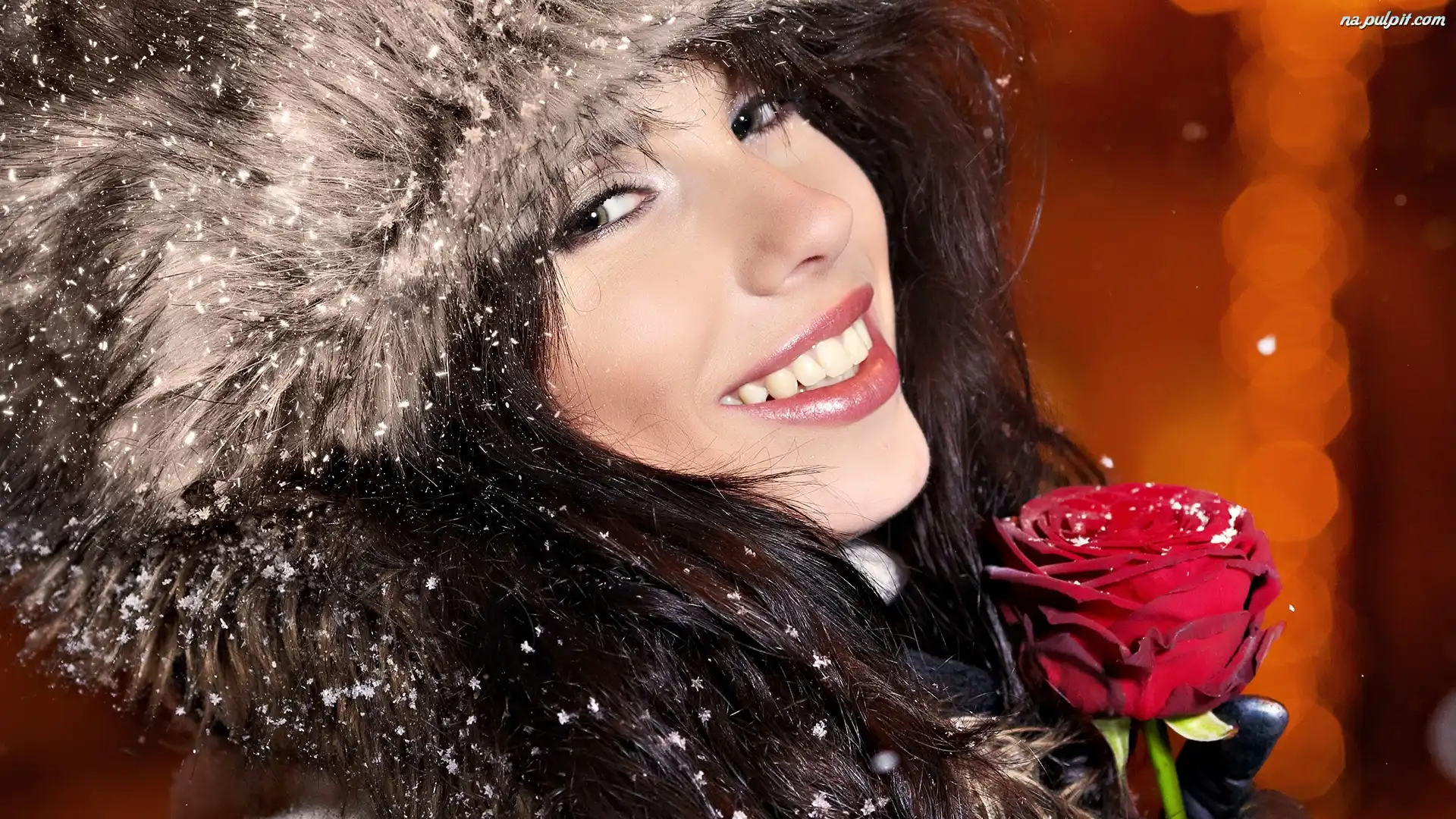 Spojrzenie, Czerwona, Róża, Zimowa, Kobieta, Czapka Na Pulpit
