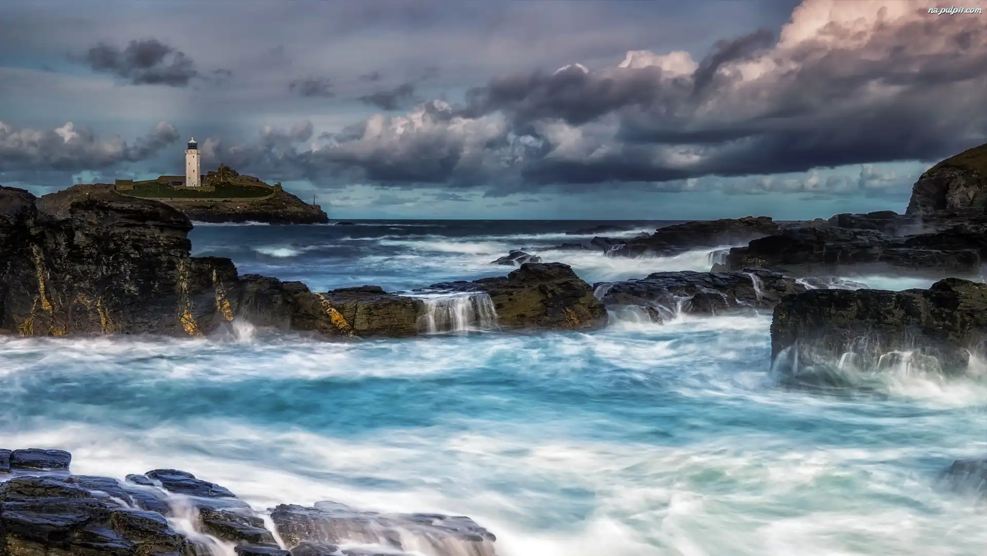Latarnia morska Godrevy, Kornwalia, Zatoka St Ives, Ciemne, Chmury, Morze, Anglia, Skały Na Pulpit