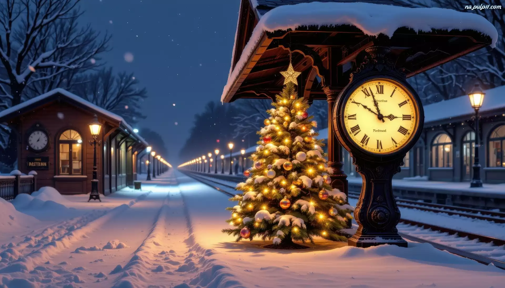 Stacja, Choinka, Dworzec, Boże Narodzenie, Noc, Peron, Zima, Zegar Na Pulpit