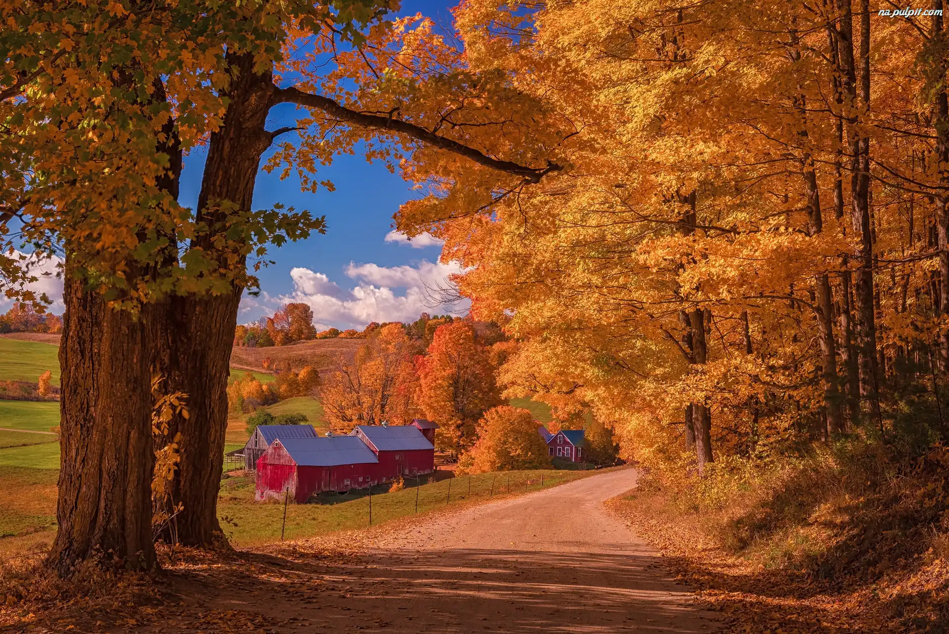 Droga, Farma Jenne Farm, Stan Vermont, Stany Zjednoczone, Domy, Stodoły, Jesień, Wieś Reading, Drzewa Na Pulpit |