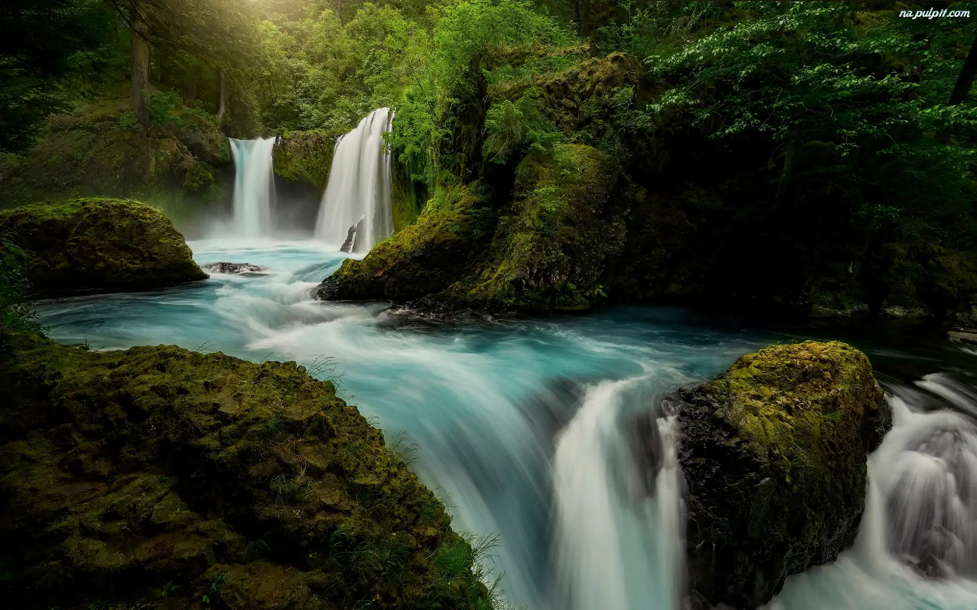 Omszałe, Stan Waszyngton, Las Narodowy Gifford Pinchot, Drzewa, Kamienie, Skały, Rzeka Little White Salmon River, Stany Zjednoczone, Wodospad Spirit Falls Na Pulpit |
