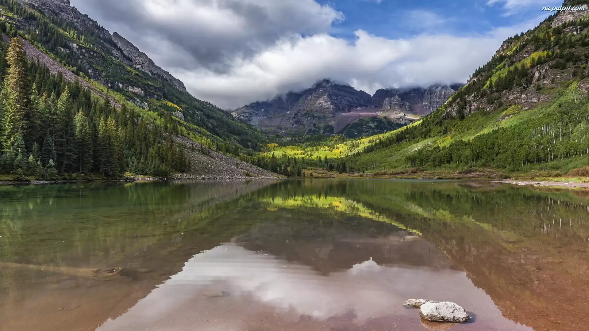 Stany Zjednoczone, Góry Skaliste, Stan Kolorado, Drzewa, Szczyty Maroon Bells, Jezioro Maroon Lake, Chmury Na Pulpit |