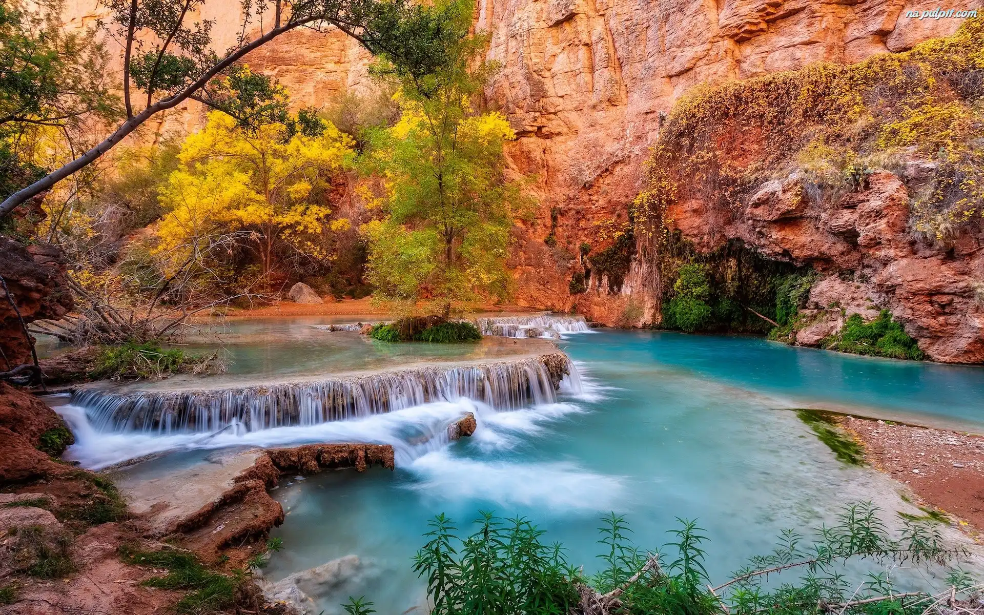 Drzewa, Kaskada, Skały, Stany Zjednoczone, Park Narodowy Grand Canyon, Havasupai Indian Reservation, Rzeka Na Pulpit |