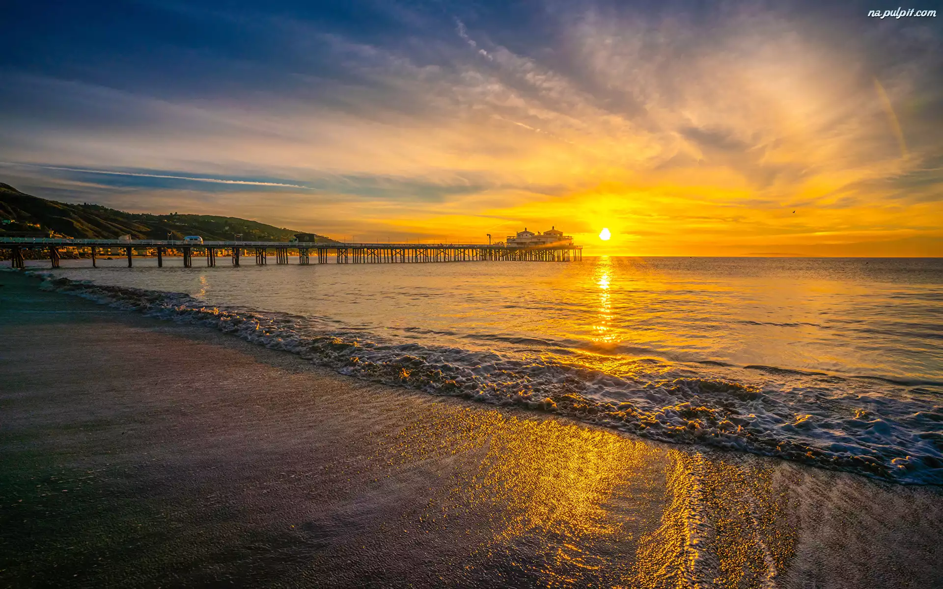 Stany Zjednoczone, Malibu, Plaża, Wschód słońca, Morze, Molo, Kalifornia Na Pulpit