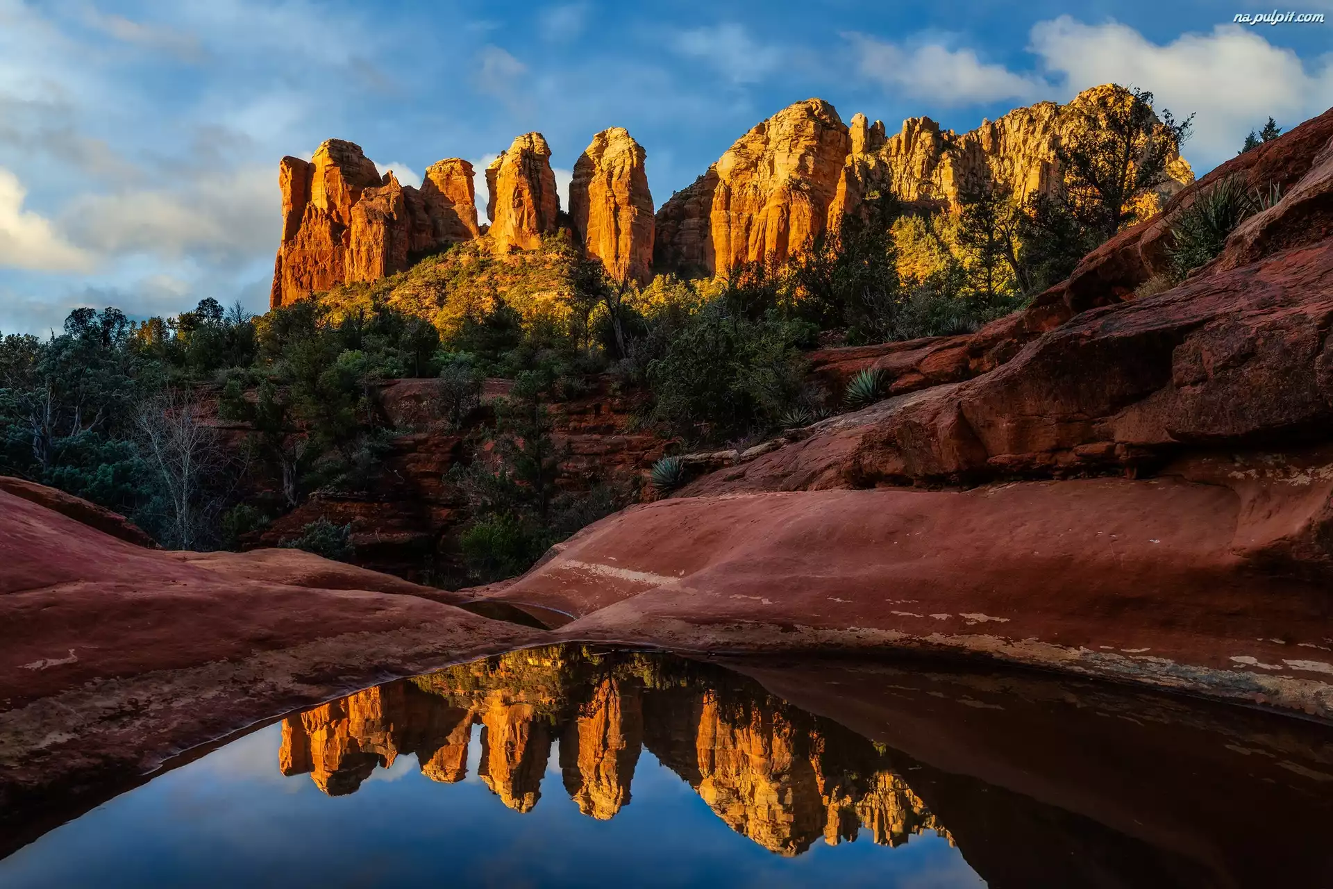 Woda, Odbicie, Arizona, Czerwone Skały, Drzewa, Sedona, Stany Zjednoczone, Seven Sacred Pools, Siedem Świętych Basenów Na Pulpit |