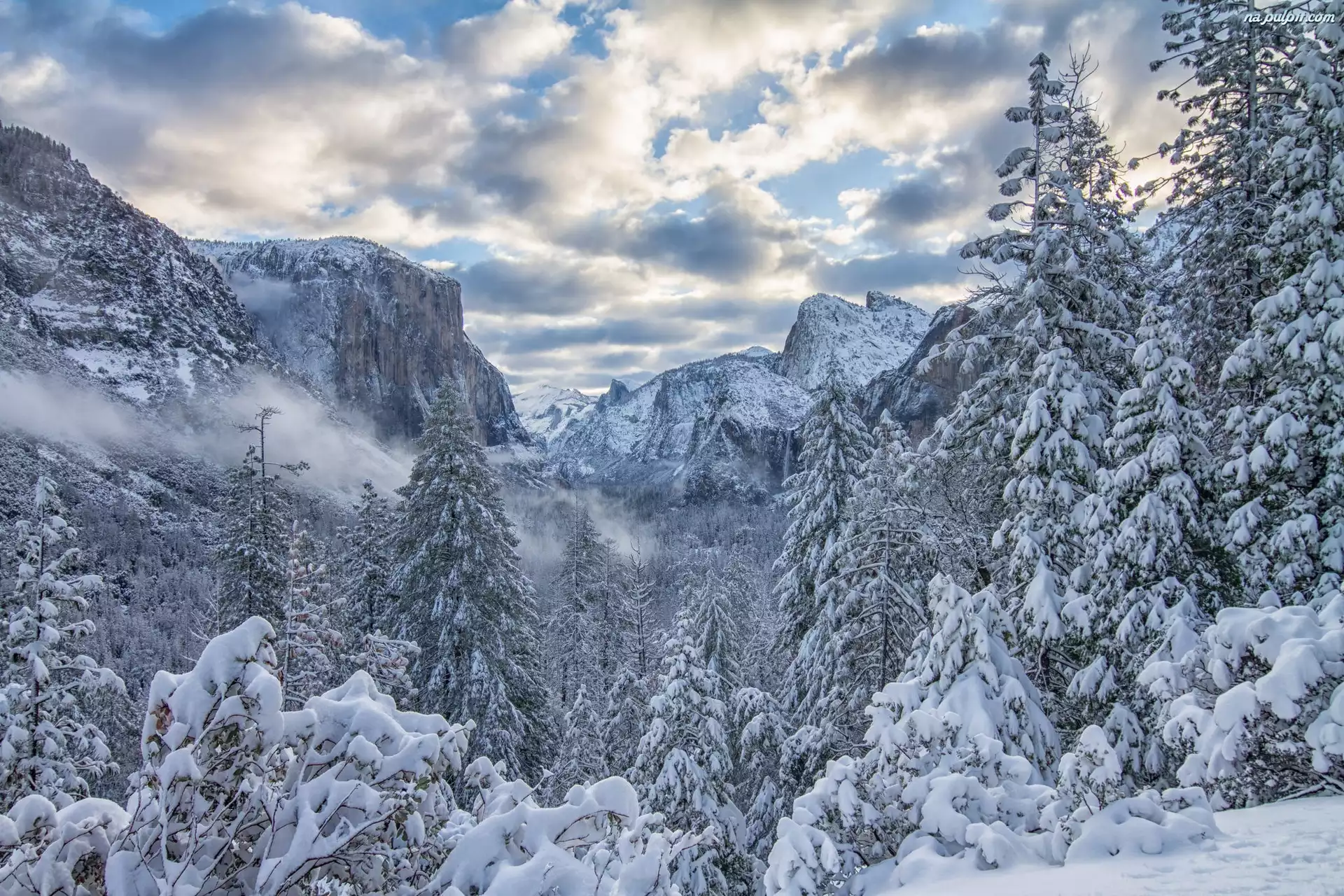 Stany Zjednoczone, Zima, Stan Kalifornia, Drzewa, Góry Sierra Nevada, Park Narodowy Yosemite, Chmury Na Pulpit |
