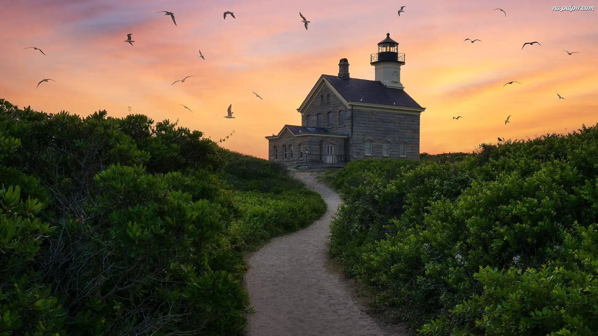 Latarnia morska, Morze, Block Island North Light, Stany Zjednoczone, Mewy, Krzewy, Stan Rhode Island, Droga Na Pulpit |
