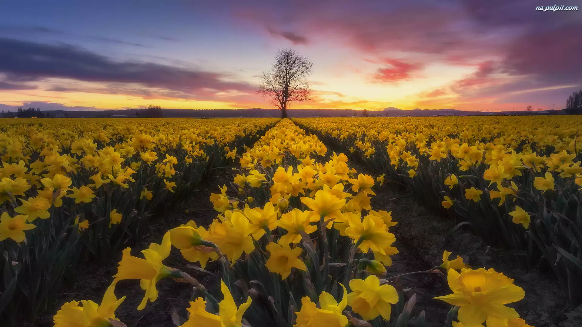 Stany Zjednoczone, Drzewo, Stan Waszyngton, Pole, Narcyzy żonkile, Dolina Skagit Valley, Zachód słońca Na Pulpit |